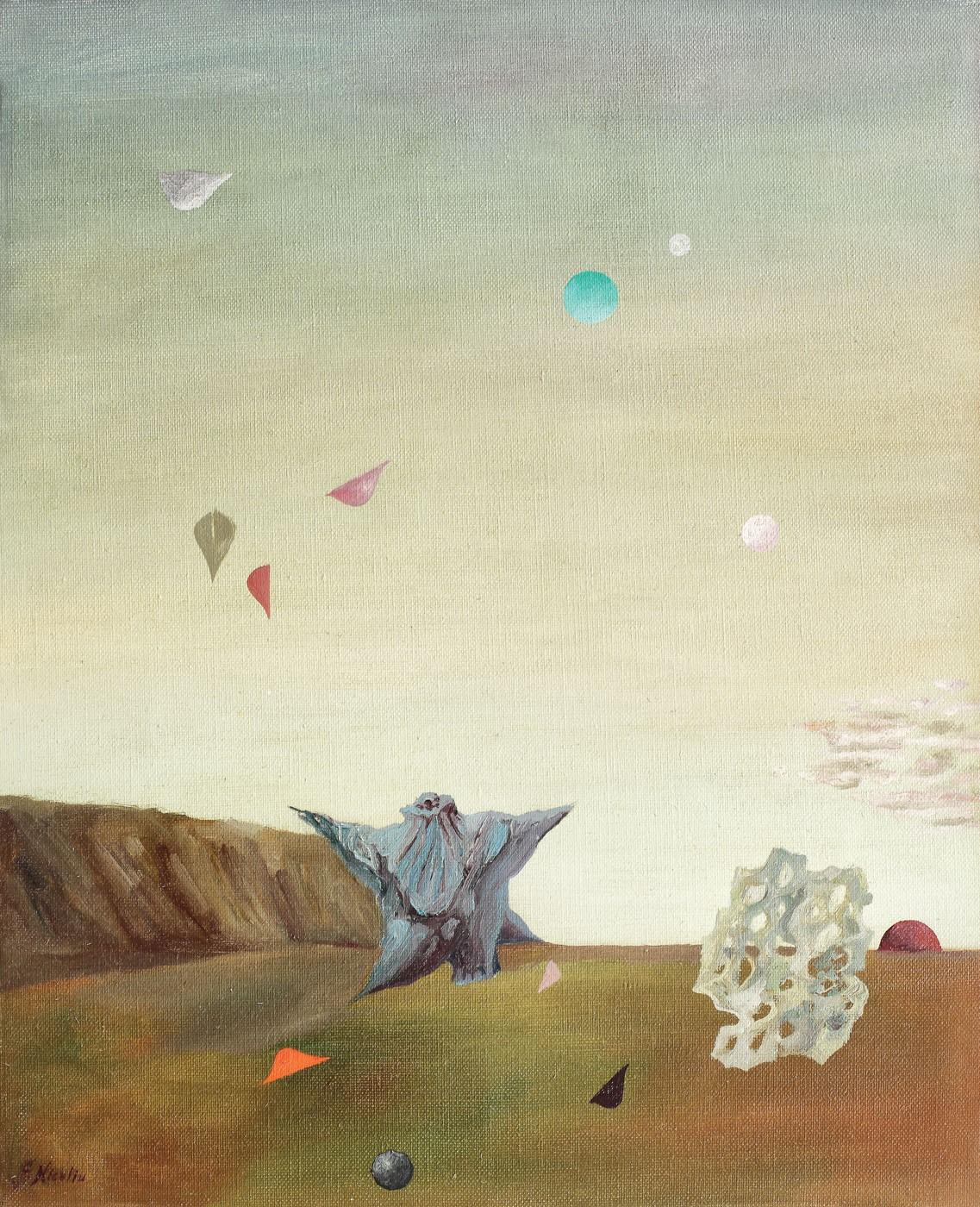semnat stânga jos, cu brun, "f. niculiu"; semnat, datat și intitulat pe verso, "Florin Niculiu, Intenții simfonice pe țărm, în zori, 1981"