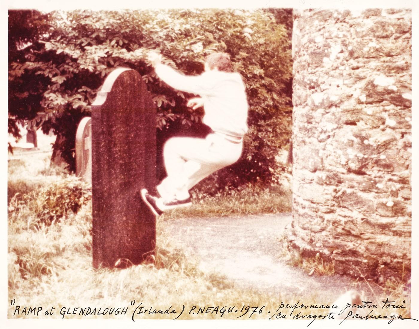notat central jos, cu negru, "Ramp at Glendalough, Irlanda, P. Neagu, 1976, performance, pentriu toni, cu dragoste paul neagu"