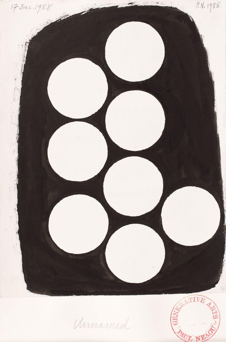 semnat dreapta sus, în creion, "P.N., 1988"; datat stânga sus, în creion, "17 dec 1988"; intitulat central jos, în creion, "Unnamed"; ștampilat dreapta jos, cu roșu, "Generative Arts, Paul Neagu"