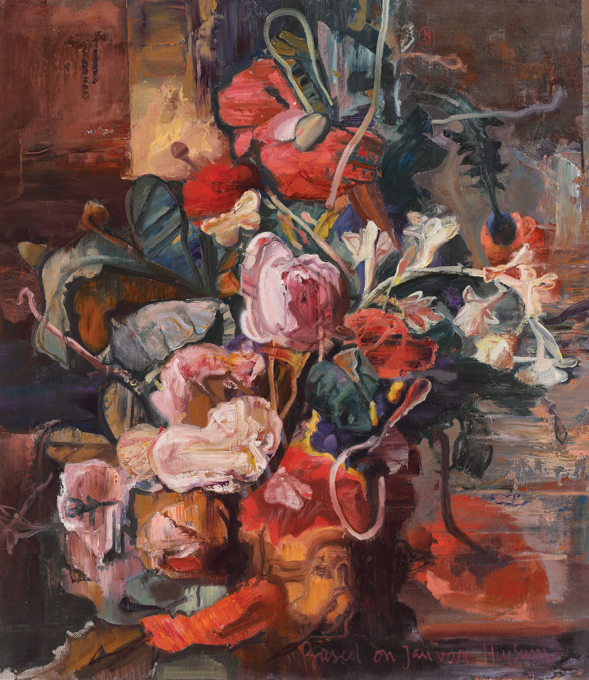 semnat și datat dreapta sus, cu roșu, în monogramă, "MN, (20)18"; intitulat dreapta jos, cu roșu, "based on Jan van Huysum"