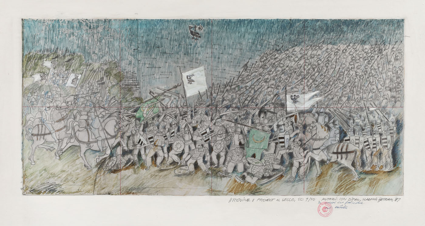 semnat, intitulat și notat dreapta jos, în creion, "Ion Bițan și Vladimir Șetran, Rovine, Proiect al secco, scara 1/10"; ștampilat și semnat dreapta jos, în pix, "Muzeul Militar, Proiect aprobat"