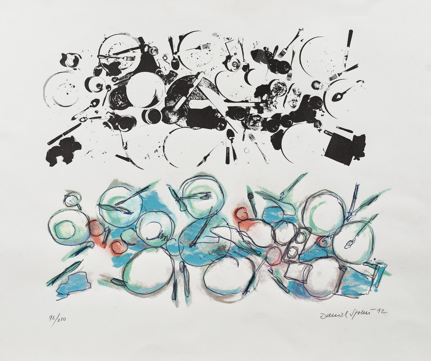 semnat și datat dreapta jos, în creion, "Daniel Spoerri, (19)92"; numerotat stânga jos, în creion, "92/ 250"