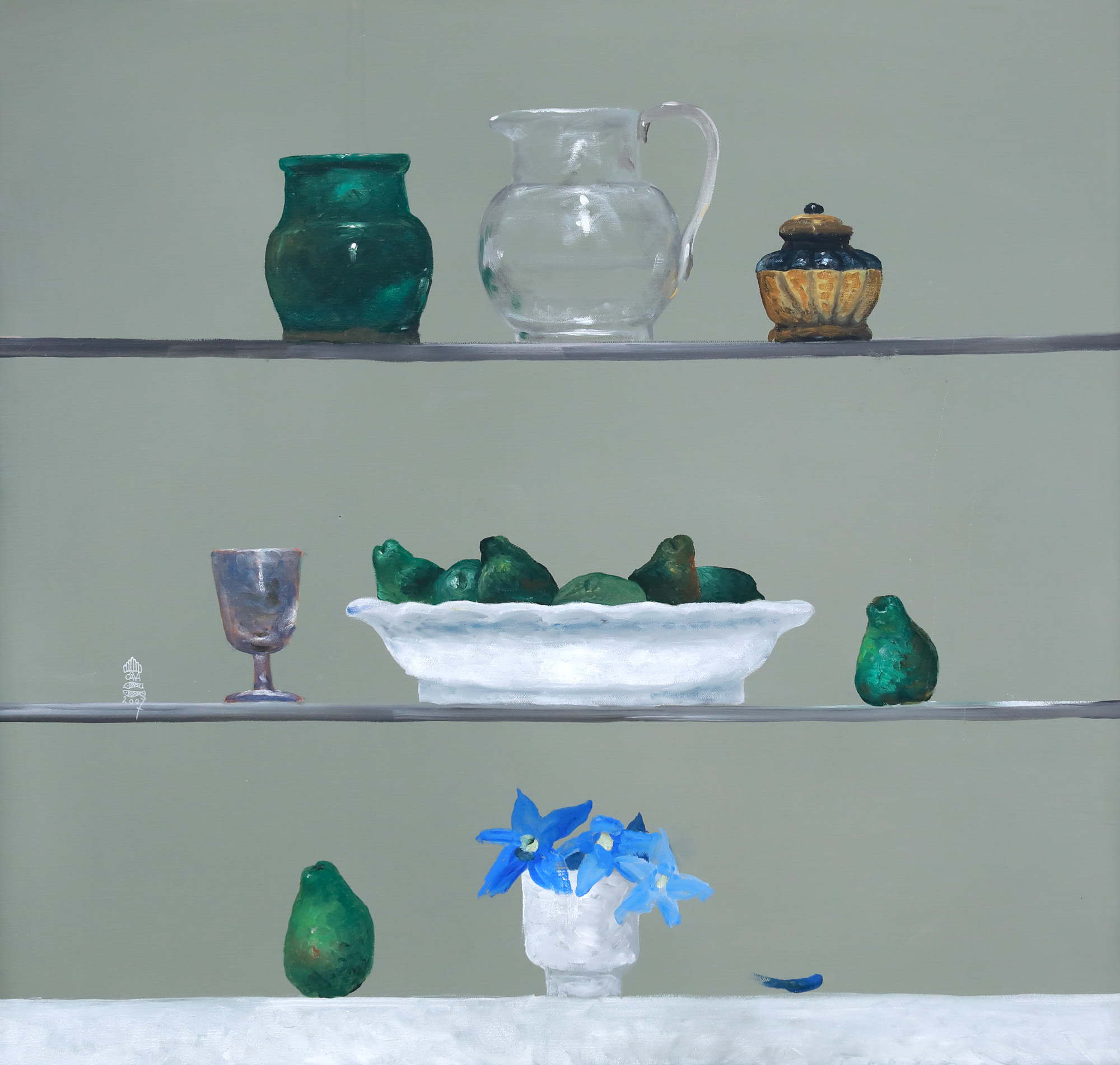 semnat și datat stânga jos în monogramă, cu alb, ”Câlția, 2007”; intitulat pe verso, cu negru, ”Cană verde”
