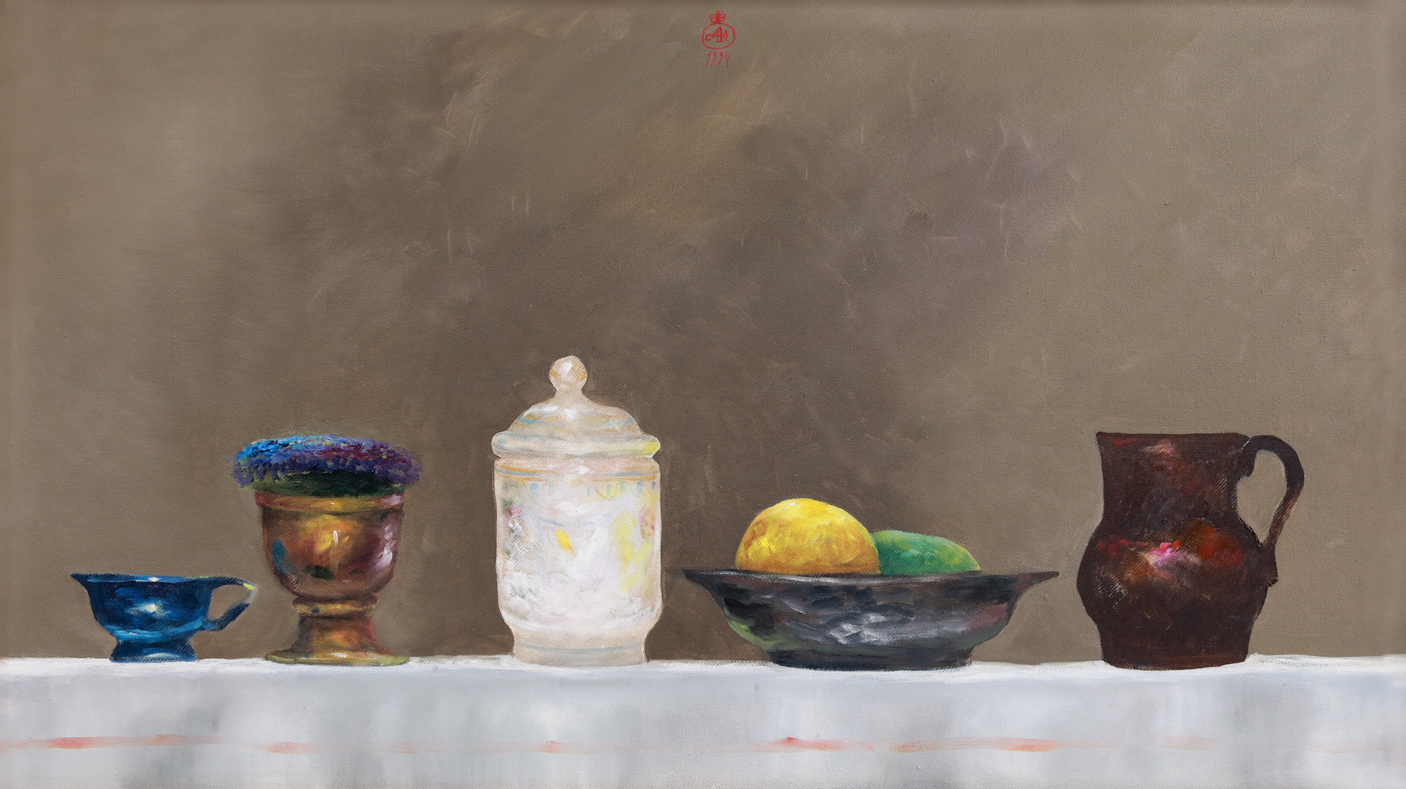 semnat și datat central sus, cu roșu, în monogramă, ”Câlția, 1994”; intitulat și datat pe verso, cu negru, ”Obiecte, 1994”