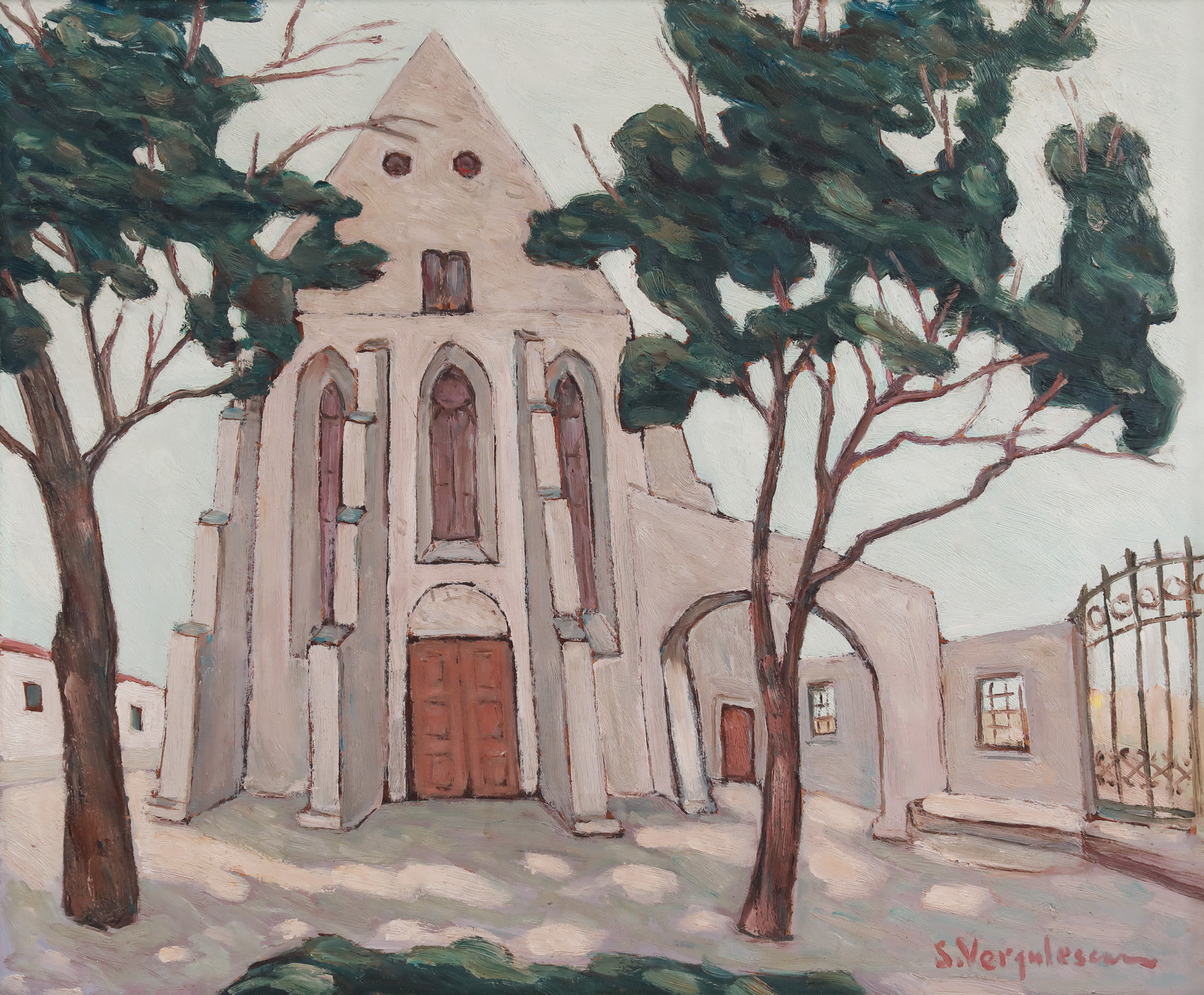 semnat dreapta jos, cu roșu, "S. Vergulescu"; semnat intitulat, datat și dedicat pe verso, cu negru, Spiru Vergulescu (n.1934, Slatina-Olt), Monument istoric clujan, 1980, Dl-ui și Dnei Braun, cu deosebită amiciție, din partea lui Spiru Vergulescu, Luni, 3 martie 1980, București”