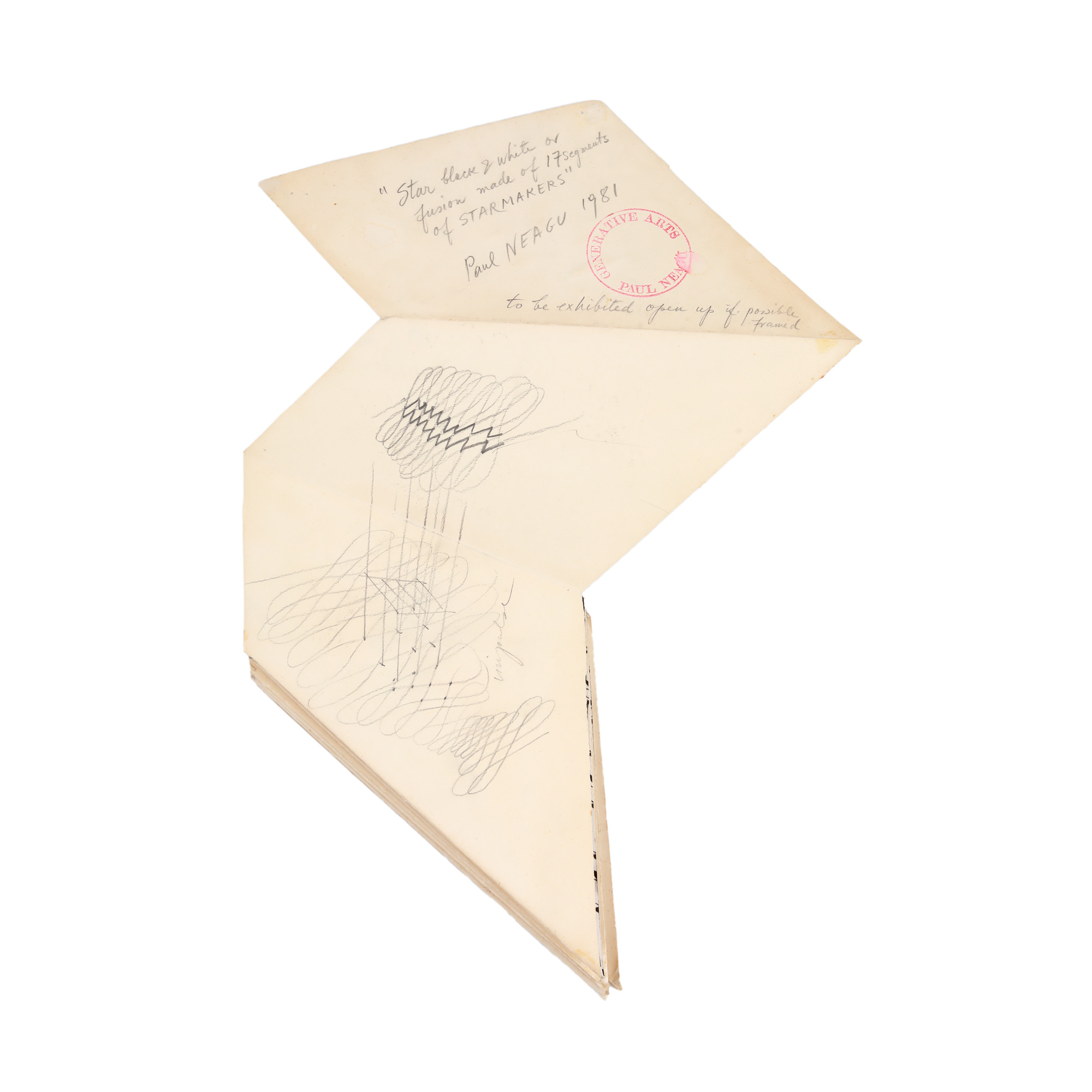 semnat, datat și intitulat pe verso, în creion, "Star black & white or fusion made of 17 segments of Starmakers, Paul Neagu, 1982"; ștampilat cu roșu, "Paul Neagu, Generative Arts"; notat în creion, "to be exhibited open up if possible framed"