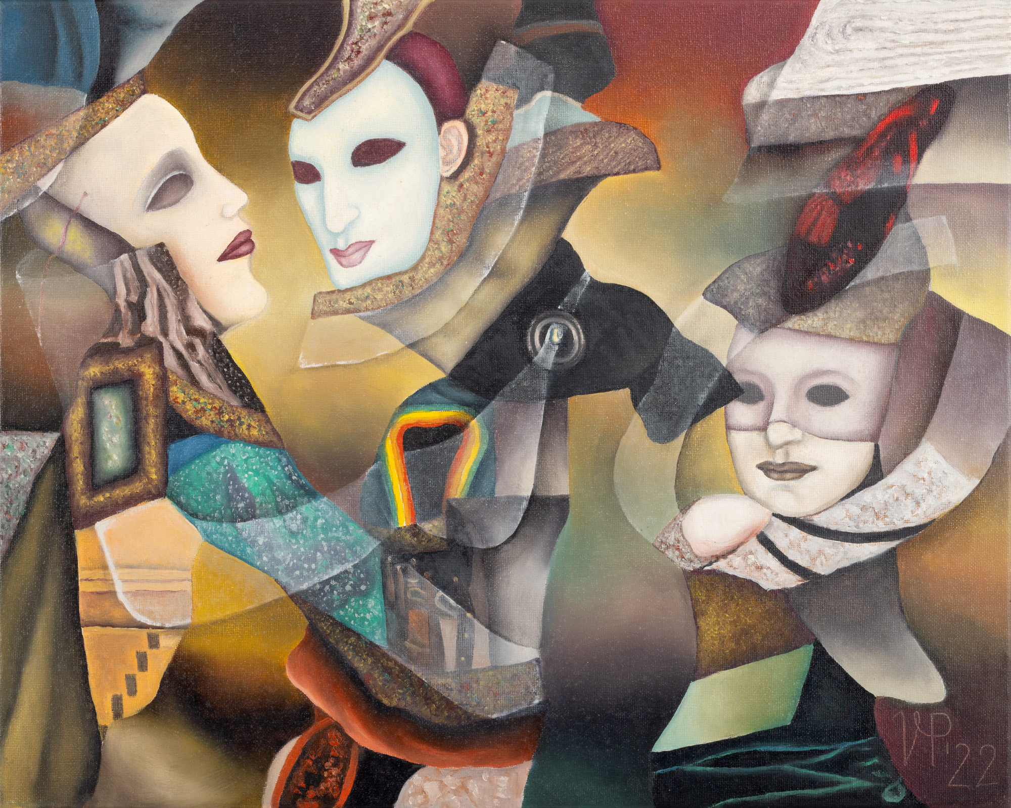 semnat și datat dreapta jos, cu alb, "VP, (20)22"; semnat, datat și intitulat pe verso, cu negru, "Petre Velicu, Carnaval, 2022"