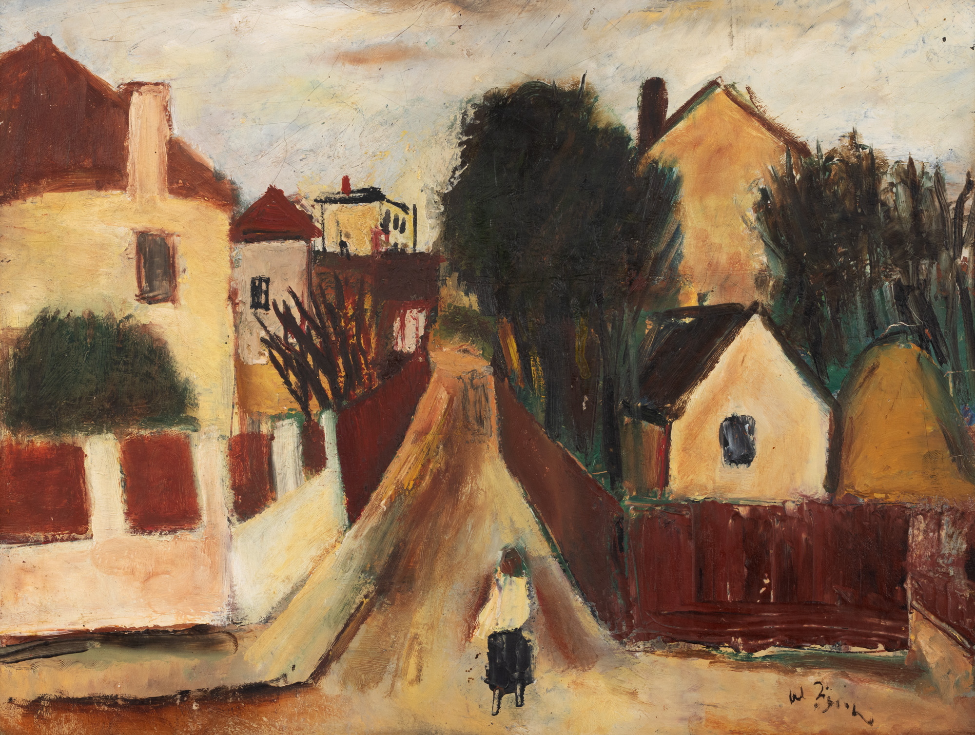 Pasionat de istorie și de artă sub toate aspectele ei, acesta a simțit cu mare sensibilitate frumusețea caracteristică a Bucureștilor, farmecul și „parfumul“ vechilor cartiere pe care le-a observat și suprins în cadrul operelor sale, unde un exemplu în acest sens este ”Cheiul Dâmboviței (1943)”. Astfel în cadrul stilului și lucrărilor realizate se poate observa înclinația și legătura deosebită pe care o acordă artei italiene și a stilului mediteraneean, datorită contactului pe care l-a avut cu această cultură în cadrul studiilor pe care le-a făcut în Italia în perioada anilor 1946-1947, dar și ca oaspete datorită invitației directorului Academiei Române din Roma, profesorul Scarlat Lambrino, unde toate acestea își lasă amprenta în realizarea peisajelor sale. În ceea ce privește lucrarea de față, artistul a încercat să suprindă aspecte ale vieții citadine ale micilor străzi ale Bucureștiului, a anilor 1960. În cadrul acesteia se poate observa ideea conturării și reprezentării unei mici străzi din București cât și reprezentarea unui personaj feminin în cadrul acestui fundal. Personajul este surprins cu spatele, într-o cămașă albă cu fustă neagră, ce este reprezentat la începutul străzii, până la parcurgerea acesteia. De-a lungul străzii și a caselor frumos amenajate și construite se pot observa atât pomi înverziți și culori predominante de verde, roșu și negru în cadrul curților ce încadrează deosebit întreaga compoziție.