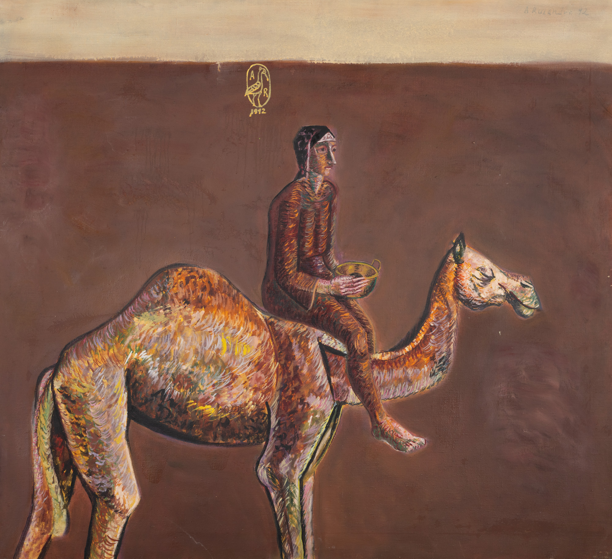 semnat și datat central sus, în monogramă, cu ocru, "AR, 1992"; semnat, datat, intitulat și notat pe verso, cu negru, "Ana Ruxandra Ilfoveanu, Regina, 1992, Detaliu din povestea biblică, Regina din Saaba"