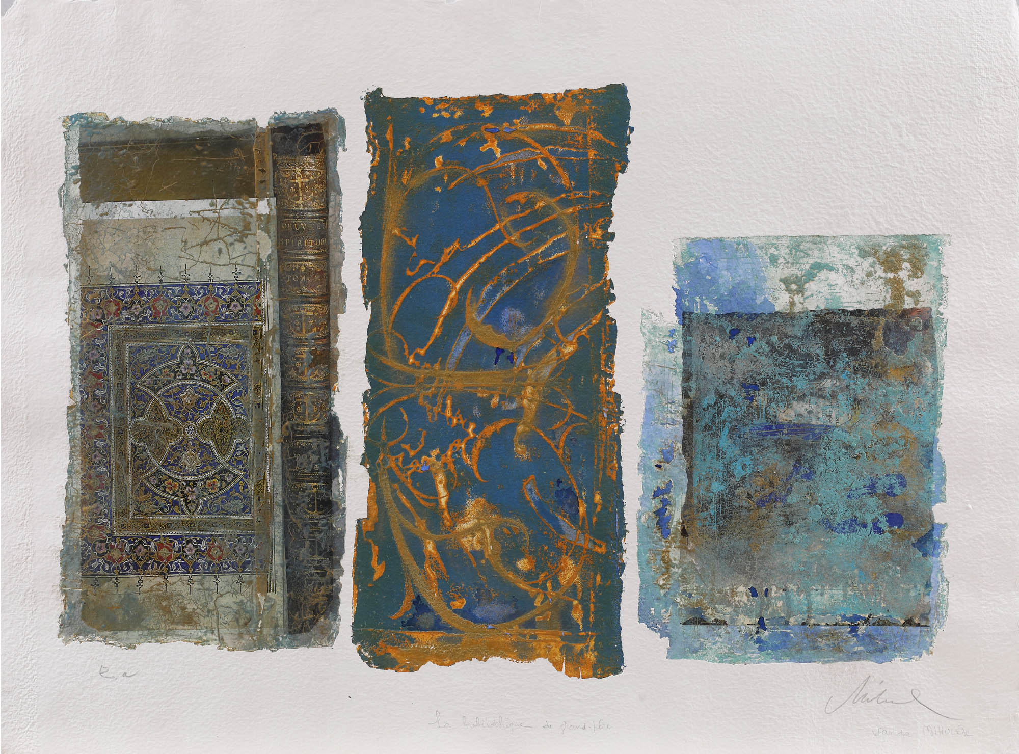 semnat dreapta jos, în creion, "Wanda Mihuleac"; intitulat central jos, în creion, "La bibliothèque de grand-père"; notat stânga jos, în creion, "E.A."