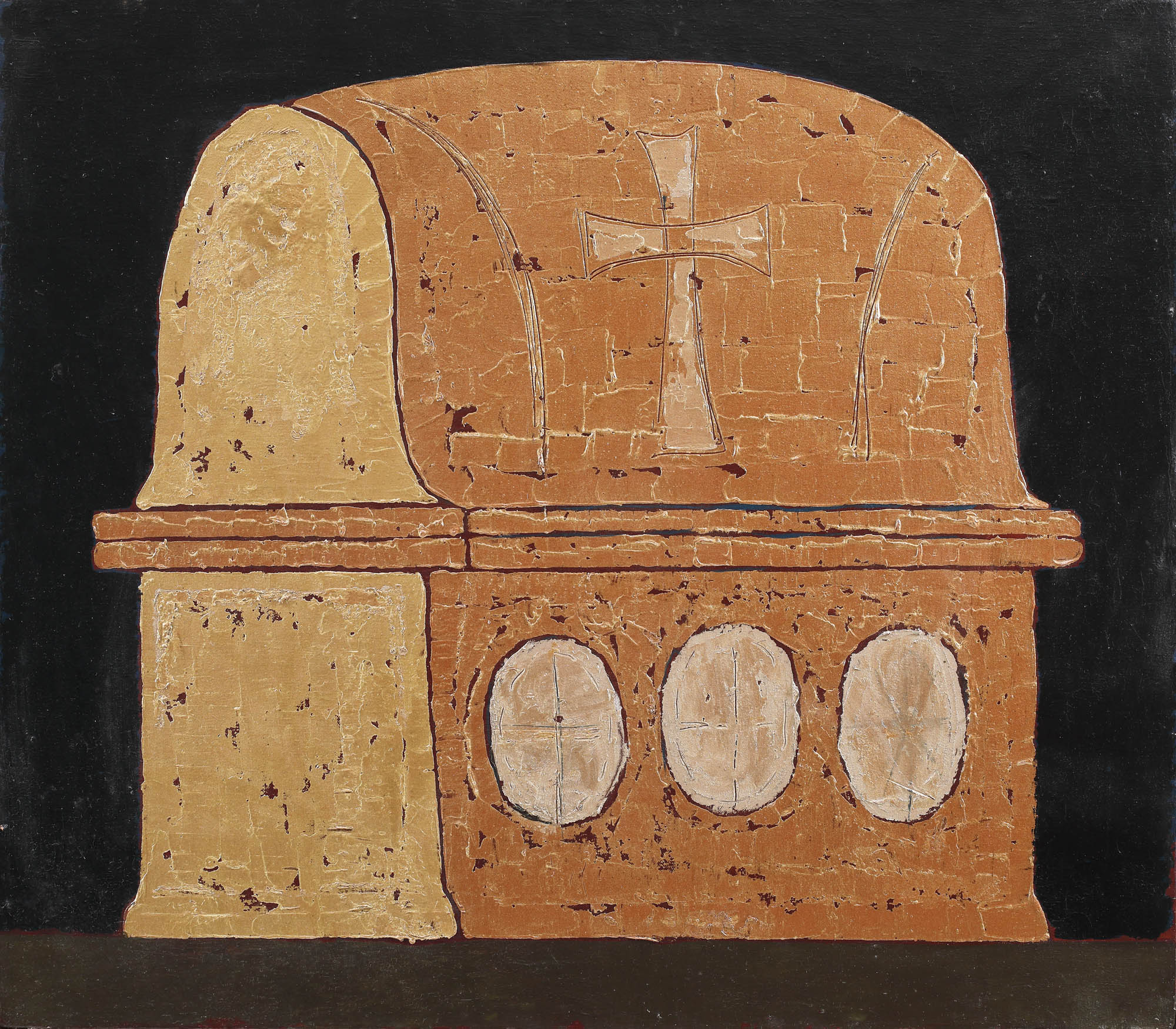 semnat, datat și intitulat pe verso, cu negru, "Marin Gherasim, Relicvar, 1990"