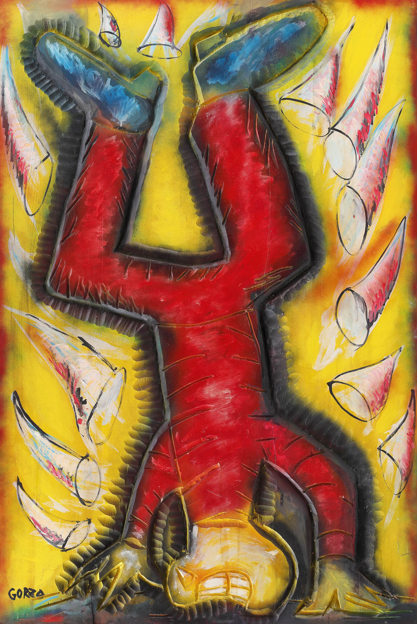 Artist plastic complex, Dumitru Gorzo este reprezentativ pentru arta contemporană românească, prin stilul său ludic, coroziv și controversat. Gorzo scrutează viața politică și socială autohtonă cu o lejeritate debordantă, metehne ale cărora sunt transpuse în operele sale prin felurite medii plastice, deseori interpretate ca fiind cvasi agresive. Alături de Nicolae Comănescu, Alina Pențac și Angela Bontaș înființează și activează în grupul numit Rostopasca, între 1997 și 2001. Picturile-obiect supradimensionate și anecdotice sunt realizate în culori vibrante și contrastante, păstrând iconografia fantastică din repertoriul personal. Spânzuratul ne trimite cu gândul la vechile picturi de tipul “pittura infamante”, comandate în Italia renascentistă, în scop defăimator, în care personajul central era ilustrat atârnat de picioare. În perioada în care rușinea era cea mai aspră pedeapsă socială, aceasta iconografie era puternic moralizatoare și stârnea sentimente puternice de frica față de nelegiuire. Culorile stridente, de asemenea, întăresc caracterul moralizator al acestei ipostaze. La polul opus, lucrarea se aseamană la fel de mult cu “Spânzuratul” din Arcana Majora a Tarotului, care deși își are influența din aceiași sursă renascentistă, simbolistica acestuia reflectă sacrificiul de sine în favoarea unei noi perspective. Tarotul ilustrează un personaj calm, în straie colorate cu roșu, simbolizând pasiunea și forța fizică și albastru, simbolizând cunoașterea. Însă ființa antropomorfă a lui Gorzo, cu toate că respectă registrul cromatic și simbolistic al Tarotului, este antagonică, punând astfel în lumină caracterul moralizator al lucrării, asemenea picturilor precursoare din Italia renascentistă. Pictura-obiect “Spânzuratul” devenine astfel o defăimare publică modernă, în tonul ludic, dar transgresiv al lui Gorzo.