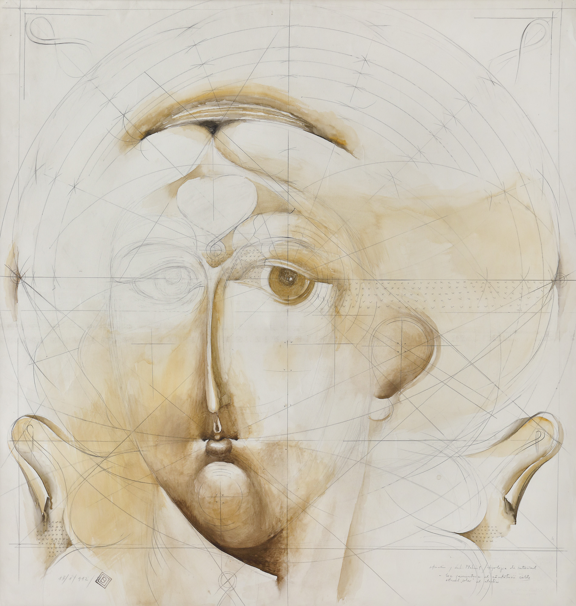 semnat și datat stânga jos, în monogramă, "SD, 13.01.(1)992"; notat stânga jos, în creion, "Studiu/ Arh. Mihail/ Tipologie de interval, loc geometric al căutăturii ciulite, sistemul solar al atenției"