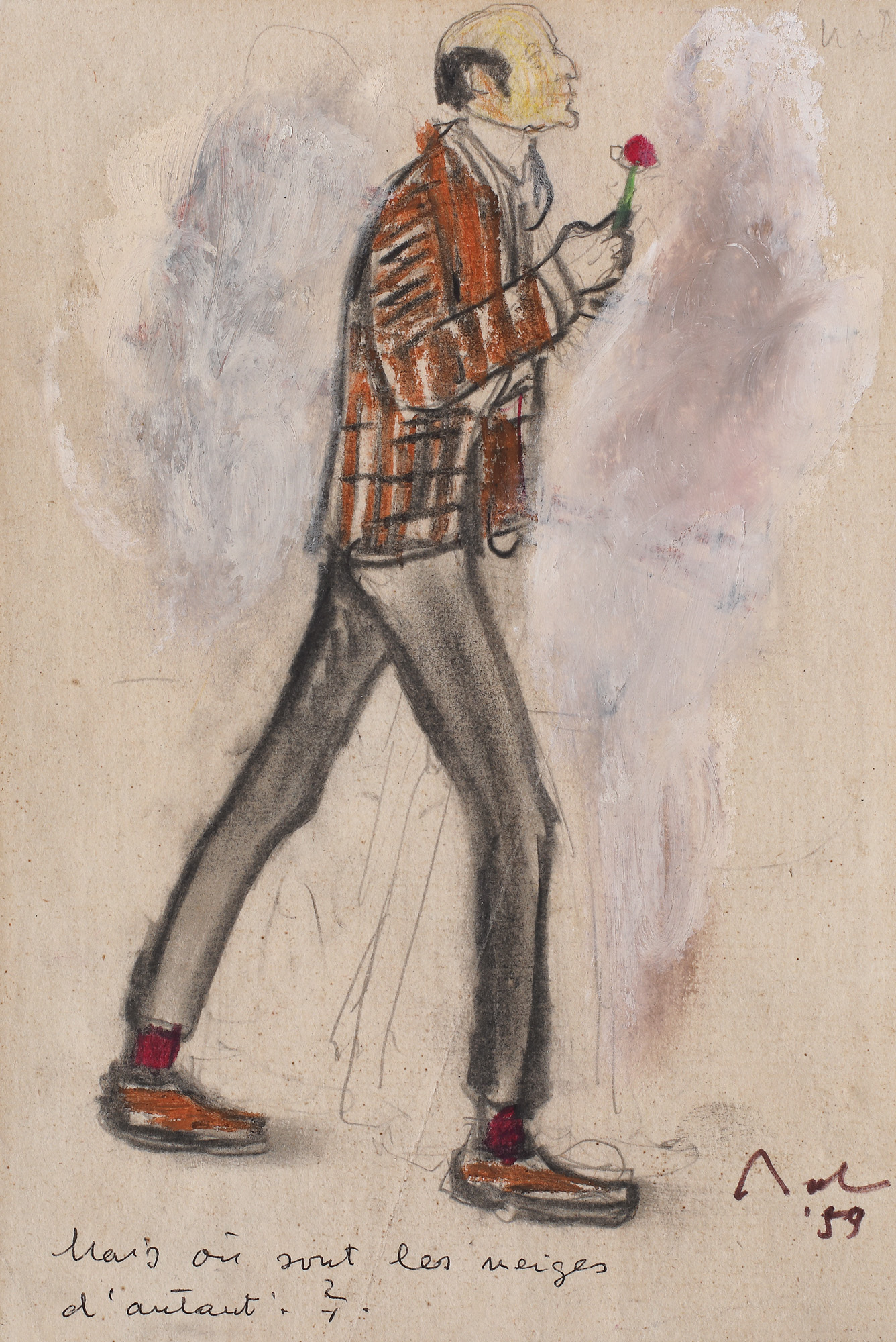 semnat și datat dreapta jos, cu brun, "Baba, (19)59"; notat central jos, cu negru, "Mais où sont les neiges d'autant?"