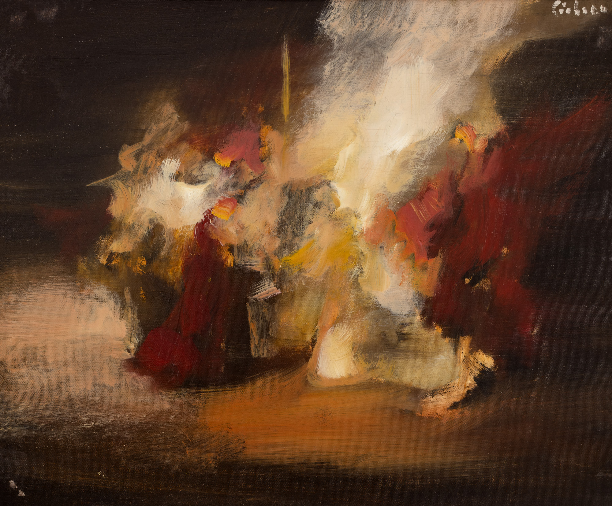 semnat dreapta sus, cu alb, "Ciobanu"; semnat, datat și intitulat, pe verso, "Mircea Ciobanu, 1980, Scene de naste"