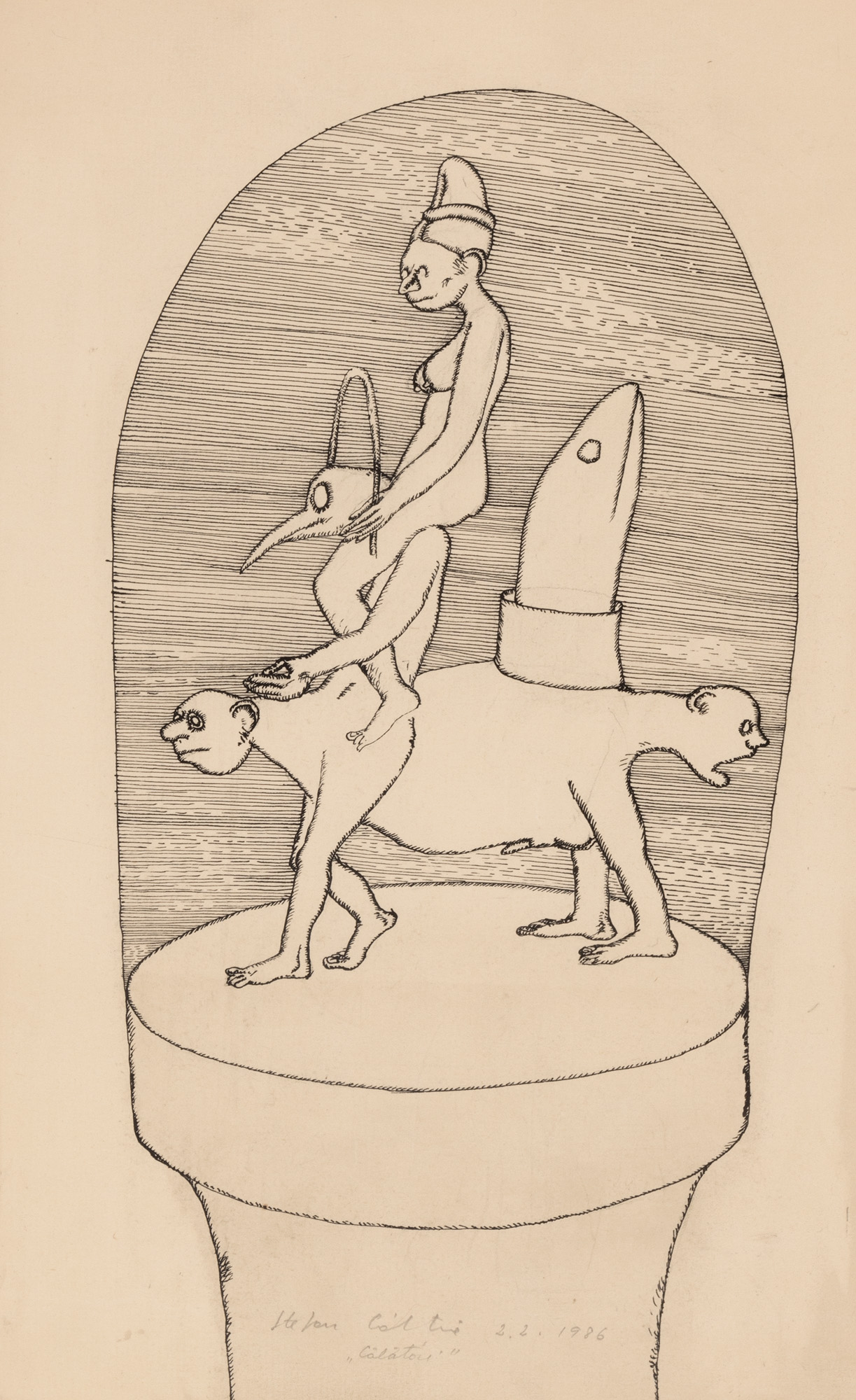 semnat, datat, și intitulat central jos, ”Stefan Câlția, 2.2.1986, ”Călători””