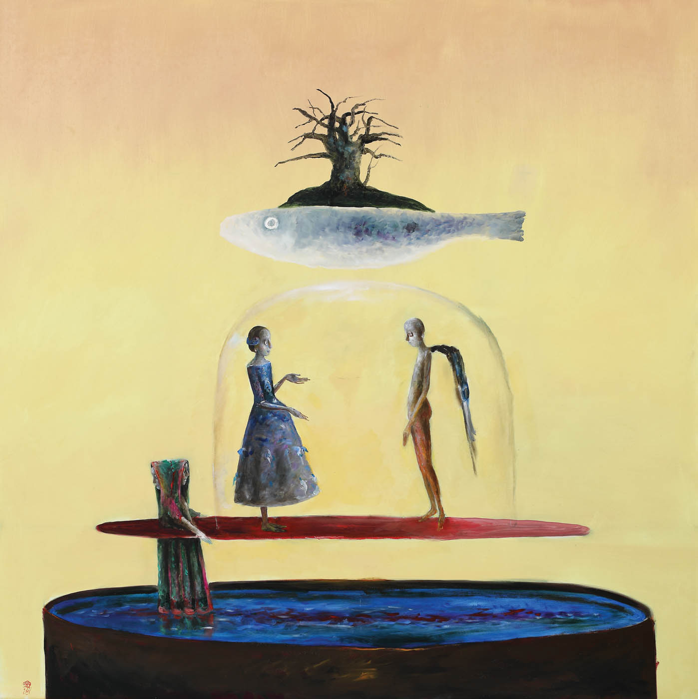 Viziunea artistului Ștefan Câlția asupra lumii pornește de la multiple ramificații culturale, care se întrepătrund și dau naștere acestor lucrări specifice, care marchează privitorul prin atmosferă și tonalitate afectivă. Avem, pe de o parte, lumea arhaică a basmelor populare românești, a personajelor fantastice; avem urme ale unor spectacole străvechi, tradiționale, cu măști și cortegii. Pe de altă parte, privitorul observă amprenta lăsată de valorile de viață din satul transilvan, în care s-a născut și crescut artistul, respectiv influențele lăsate de anii de studiu sub Julius Podlipny. În lucrarea curentă, personajele au funcții decisive: un cuplu primordial, primii locuitori ai pământului, personajul masculin având aripi de înger, sugerând originea divină a omului. Personajele concentrează principalele semnificații ale imaginii, asemenea rolului personajelor dintr-o fabulă, potențând tâlcul firului narativ. În lucrarea “Ianus pe apă”, se disting două tipuri de personaje: pe de o parte, personajele umane, cu figurile lor hieratice asemenea unor îngeri pământeni, respectiv personajul animal, întruchipat prin motivul peștelui. Motivul peștelui nu este doar unul din cele mai frecvente din creația maestrului, ci și unul din primele simboluri ale umanității, folosit în cele mai diverse combinații. “În compozițiile lui Ștefan Câlția, simbolismul peștelui se apropie mai mult de interpretările date acestui motiv de câțiva artiști moderni, în special din aria expresionismului german: Max Beckmann, Paul Klee, Marc Chagall. În opera acestora, imaginea carnavalului, a jocului păpușăresc a avut loc de frunte, iar peștele are semnificații magic-mistice, un punct de întâlnire între viață și moarte”(Amelia Pavel). În această lucrare, apare și un simbol protectiv, un element de recuzită: clopotul de sticlă ocrotind cele două personaje. În atmosfera protectivă a sticlei, personajele par să se simtă în siguranță. De la maestrul său Corneliu Baba, artistul a preluat talentul de a-și transpune personajele plastic într-o expresivitate tăcută, golite de gânduri.