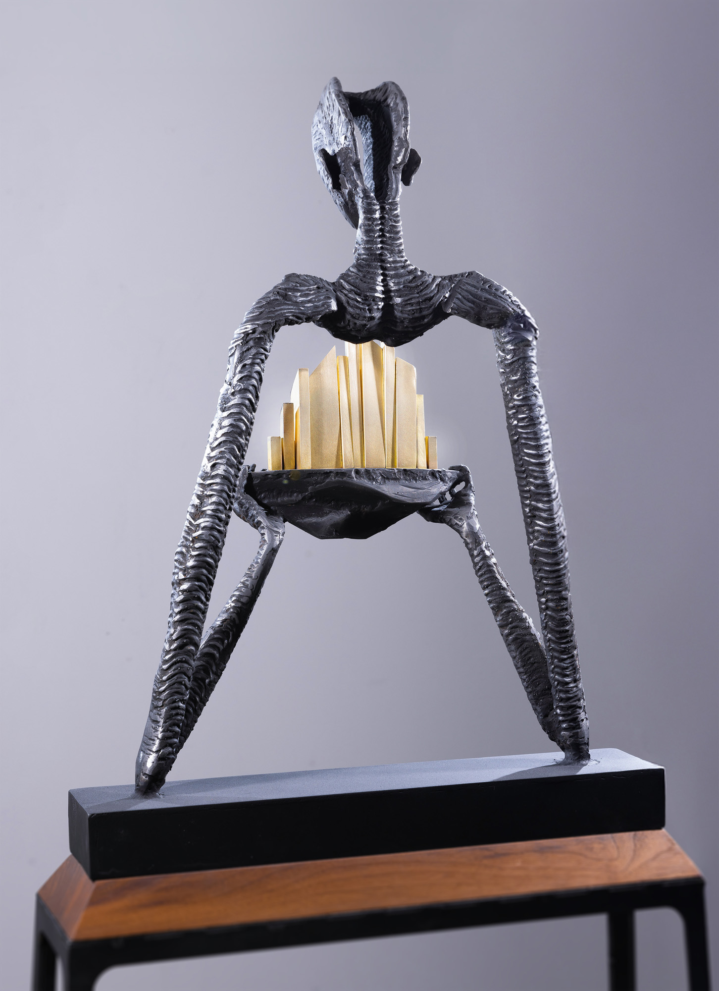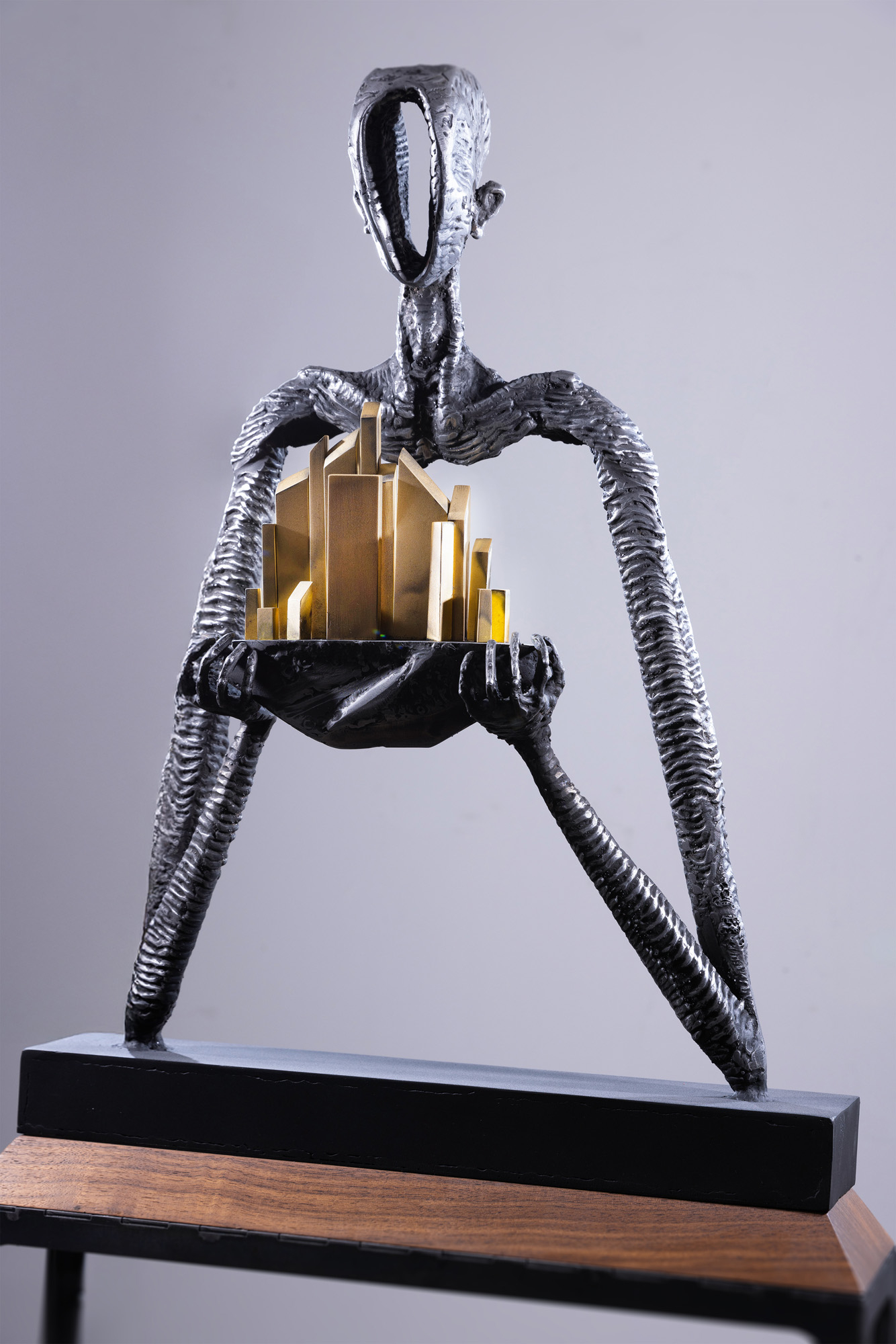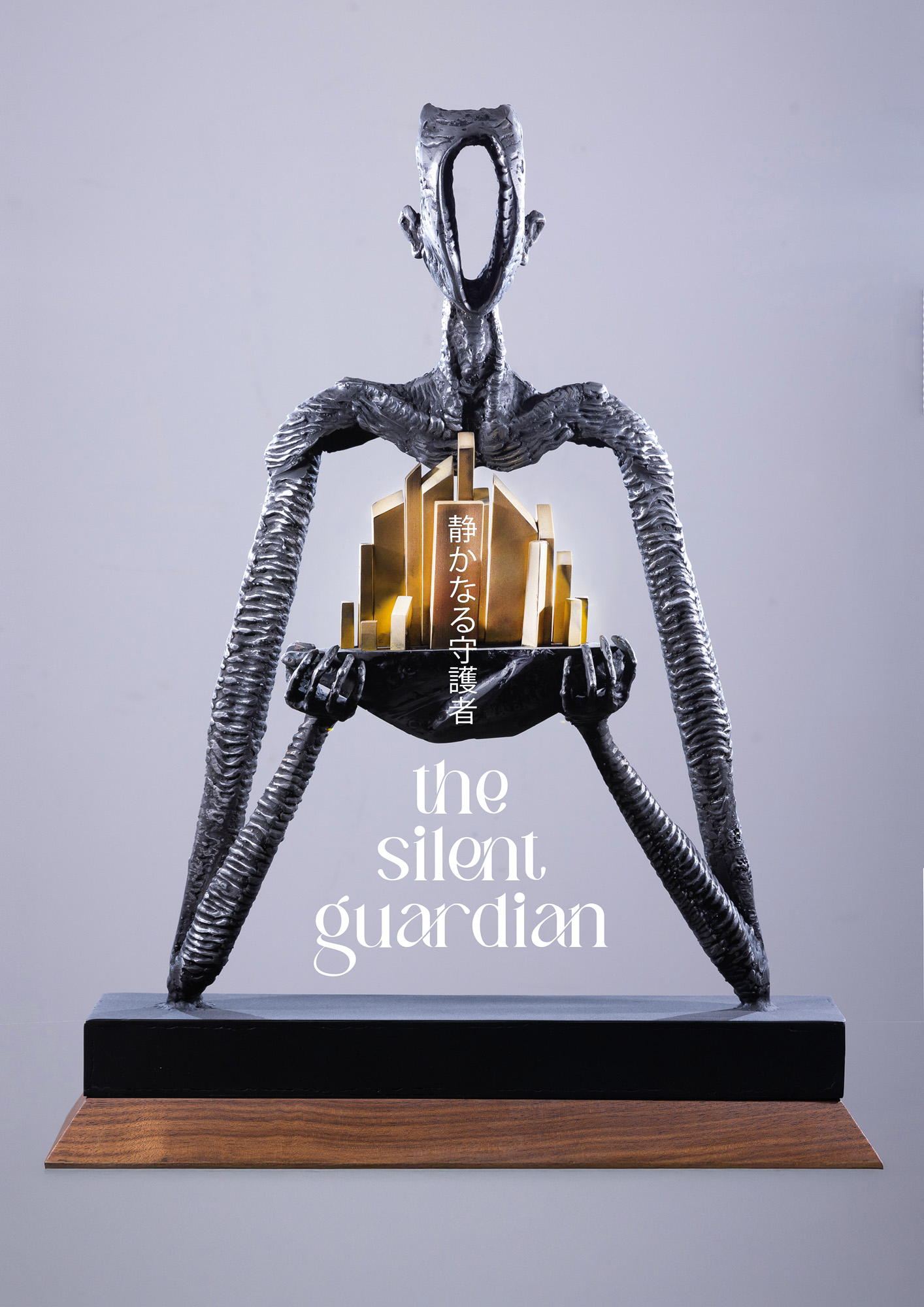 Lucrarea "The Silent Guardian", una dintre creațiile definitorii din portofoliul artistului, întruchipează o reflecție profundă asupra relației dintre om, oraș și mediu. Silueta sa alungită, modelată manual din oțel, transmite o forță interioară reținută — aceea a unui protector tăcut, un gardian care veghează cu grijă asupra lumii create de om. Elementele aurii din interiorul compoziției, inspirate de structuri urbane, simbolizează fragilitatea echilibrului dintre progres și responsabilitate. Contrastul dintre textura dură a oțelului și strălucirea caldă a alamei creează o tensiune vizuală care vorbește despre speranță, dar și despre fragilitatea civilizației contemporane.