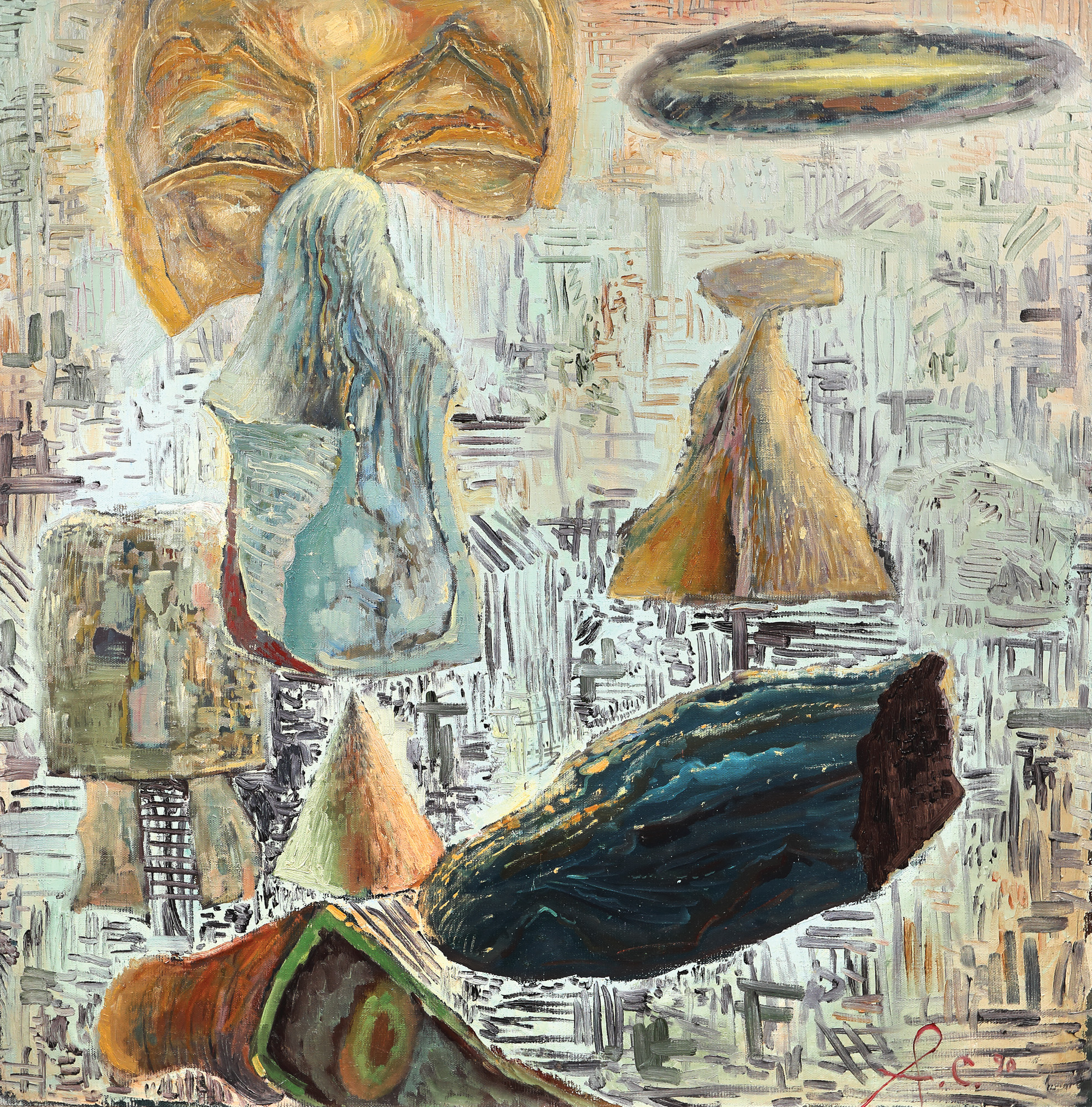 semnat și datat dreapta jos, cu roșu, "fc, (19)90"