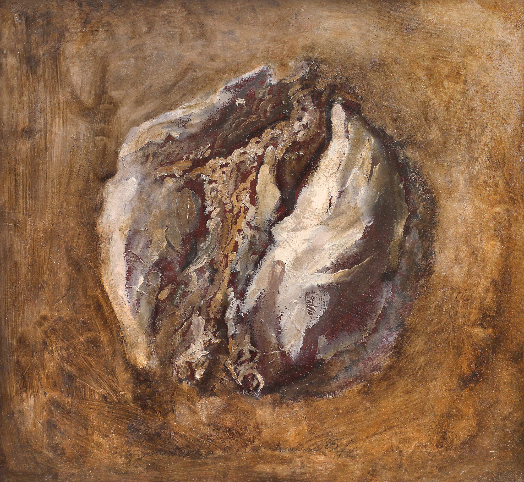 semnat și datat central jos, cu negru, "Constantin Flondor, Ianuarie (19)85/86"; semnat, datat și intitulat pe verso, cu negru, "Constantin Flondor, Aluat, 1985-1986"