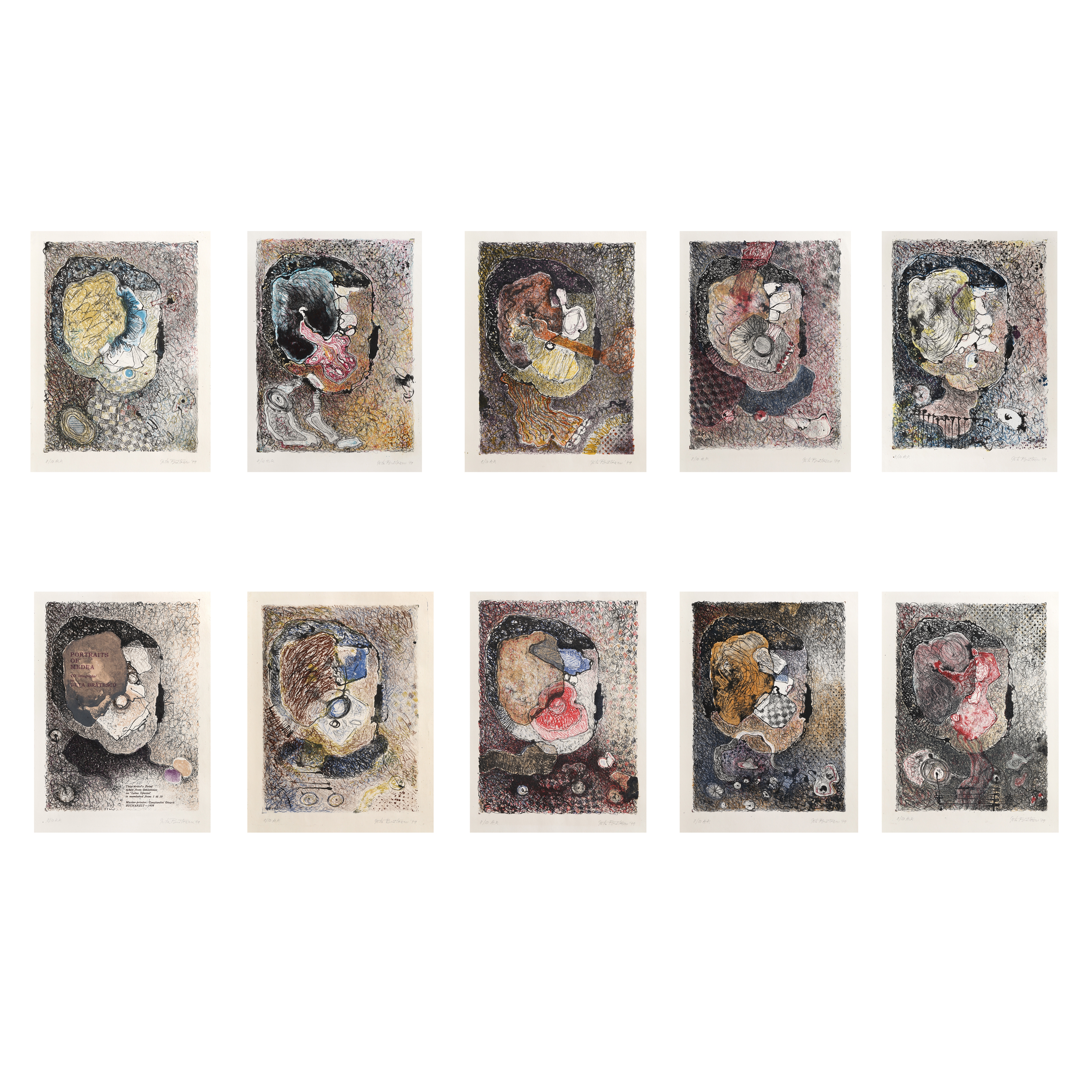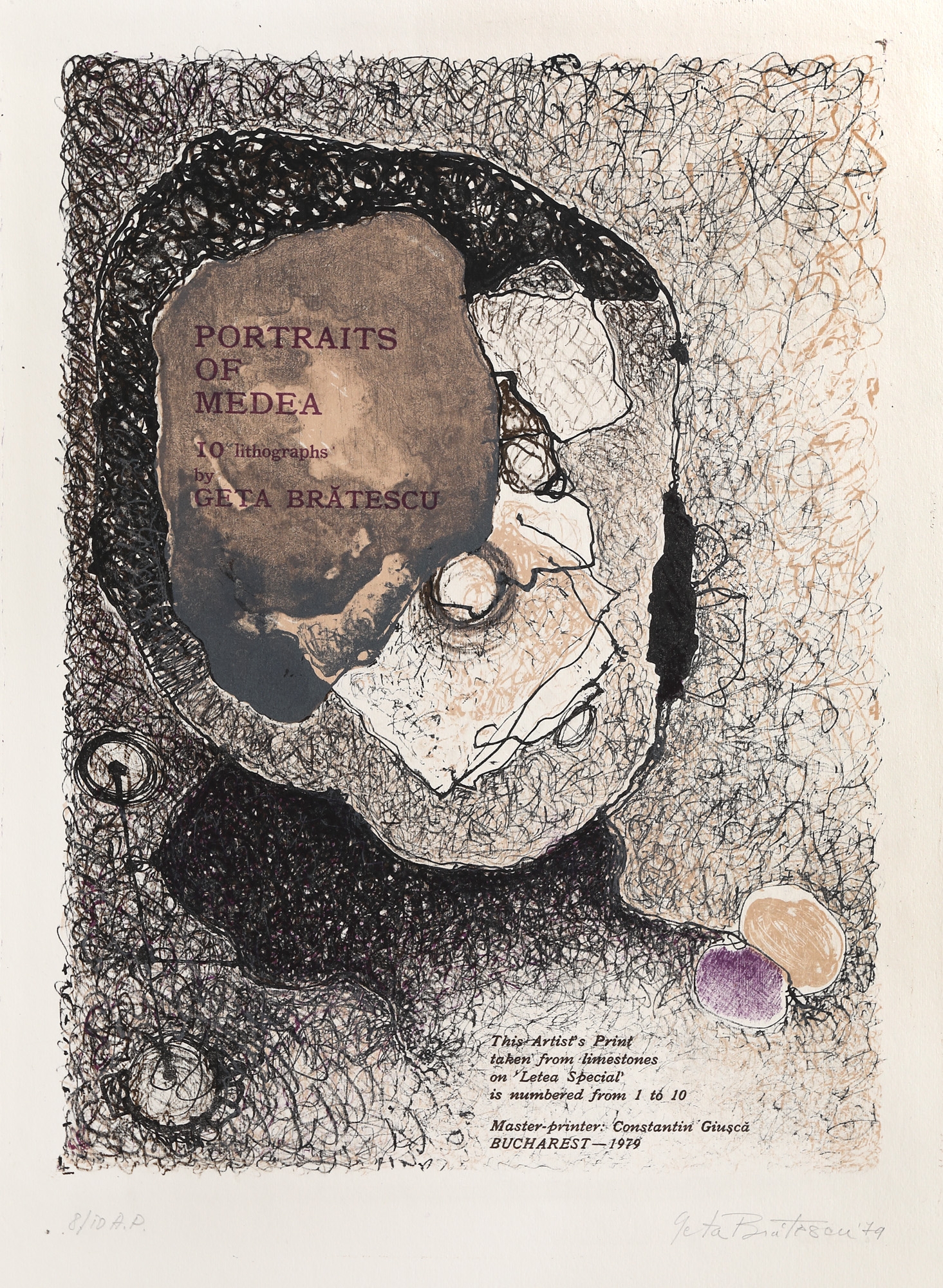 Figura mitologică a Medeei, care îl ajută pe iubitul ei Iason, liderul Argonauților, să câștige Lâna de Aur, dar apoi își ucide cei doi copii în răzbunare, nu numai că a fost în viață în literatura mondială de peste 2400 de ani, dar și pe scena teatrului, în muzică (operă, balet, dans modern), în arte plastice, iar din secolul XX și în film. Mitologia, literatura sunt surse de inspirație recurente în creația Getei Brătescu, cu referințe de la Samuel Beckett la Esop. Însă motivul care vizitează cel mai des lucrările artistei este figura și numele personajului mitologic Medeea. În spațiul mental al artistei, femeia este o creatoare, iar personalitatea Medeei este cea care se pliază cel mai bine convingerilor artistei. “Medeea reprezintă extremele, iubirea și ura. Nu există cale de mijloc cu Medeea. Este o femeie specială”, declara artista. Personajul anti-feminin din tragedia eponimă a lui Euripide, Medeea este care care își ucide proprii copii pentru a pedepsi trădarea soțului. Însă tragedia lui Euripide prezintă doar jumătate din poveste, după ce Medeea este părăsită de Iason, fără a se contura astfel portretul complex al femeii. Ștefan Augustin Doinaș remarcă în cele zece litografii “Portrete ale Medeei” o notă firească de căldură și transparență. Suita de culori are rolul de a enumera stările interioare, sufletești, dispoziții ce transpar pe chipul unei persoane. Acesta din urmă devine oglinda mereu schimbătoare a unui eveniment interior.