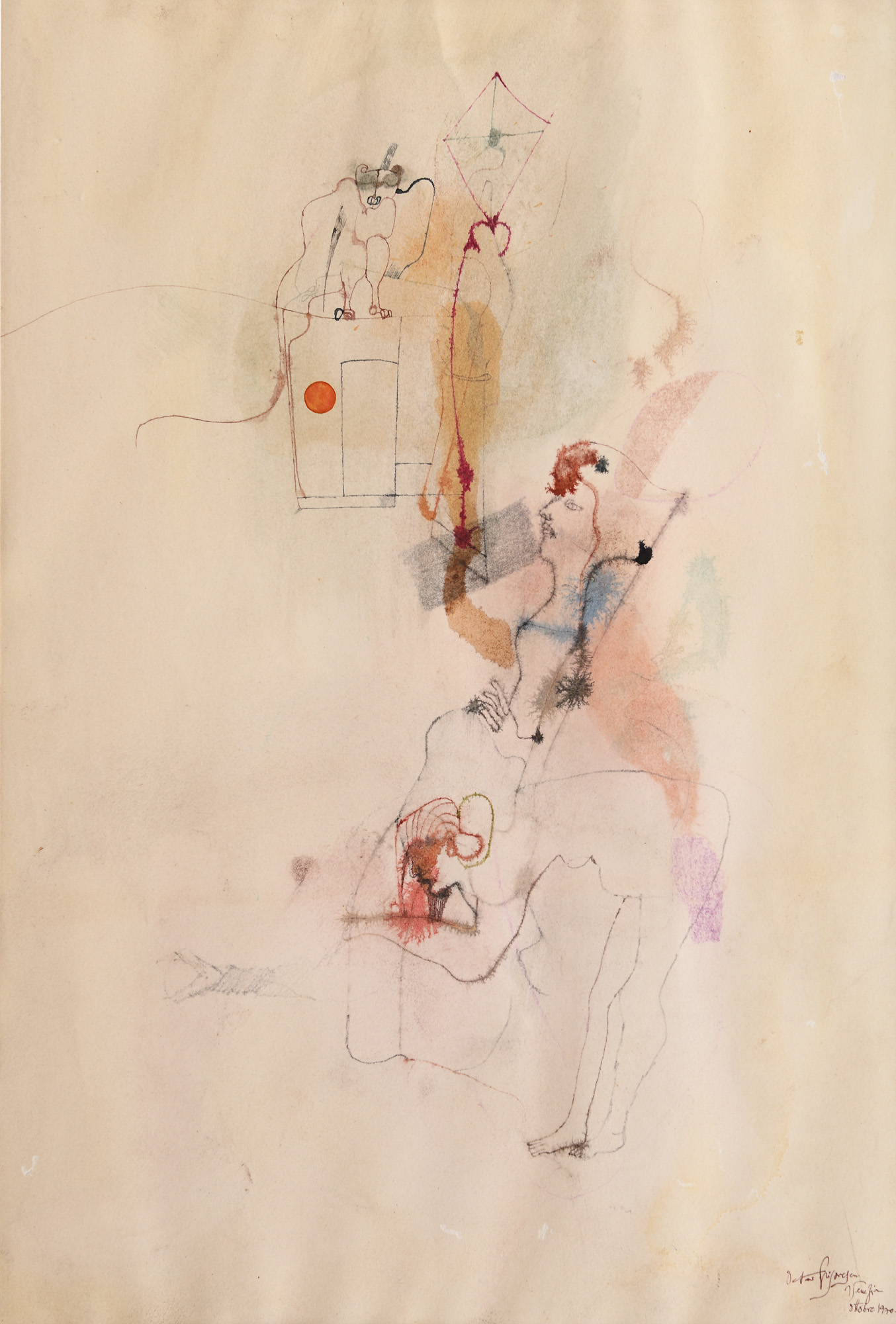 acuarelă, tuș, creioane colorate și pixuri colorate pe hârtie