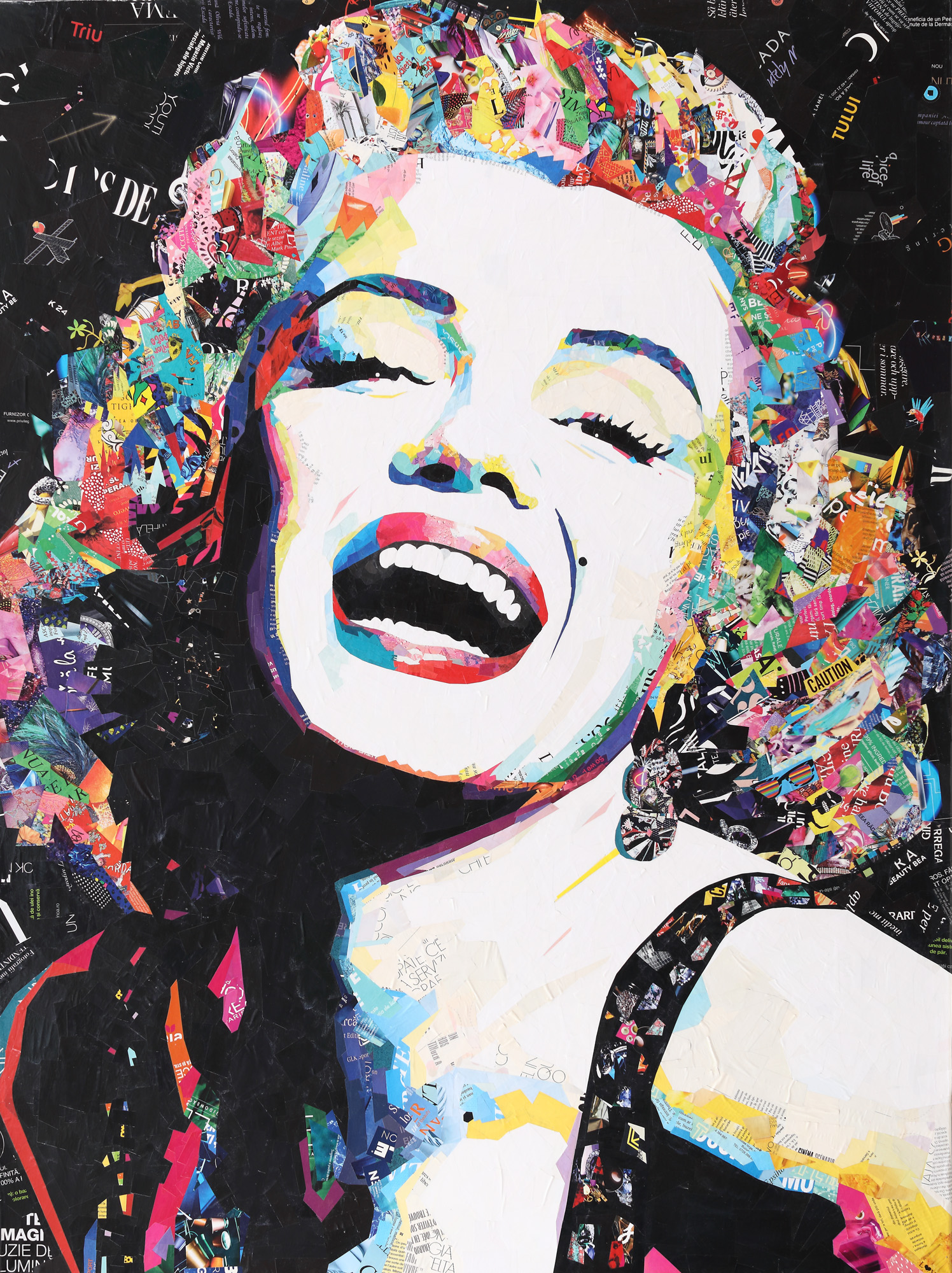 colaj din reviste reciclate, tăiate și lipite manual pe pânză