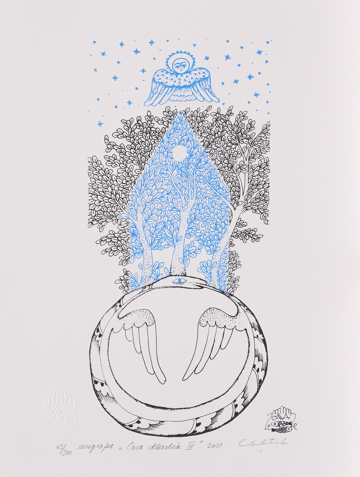 semnat, datat, intitulat și numerotat central jos, în creion, "Câlția, Casă albastră IV, 2021, 65/ 300"
