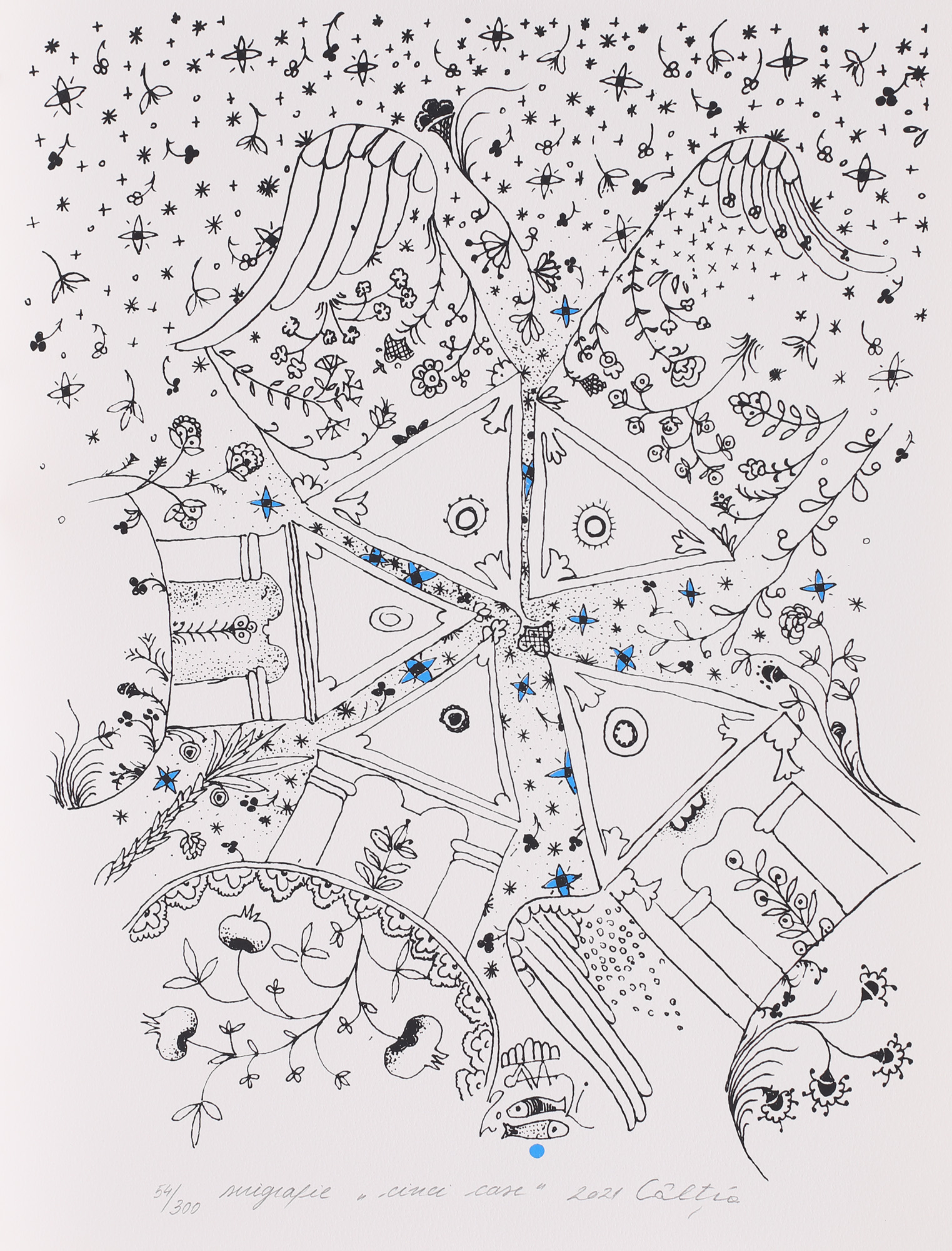 semnat, datat, intitulat și numerotat central jos, în creion, "Câlția, Casă albastră V, 2021, 54/ 300"