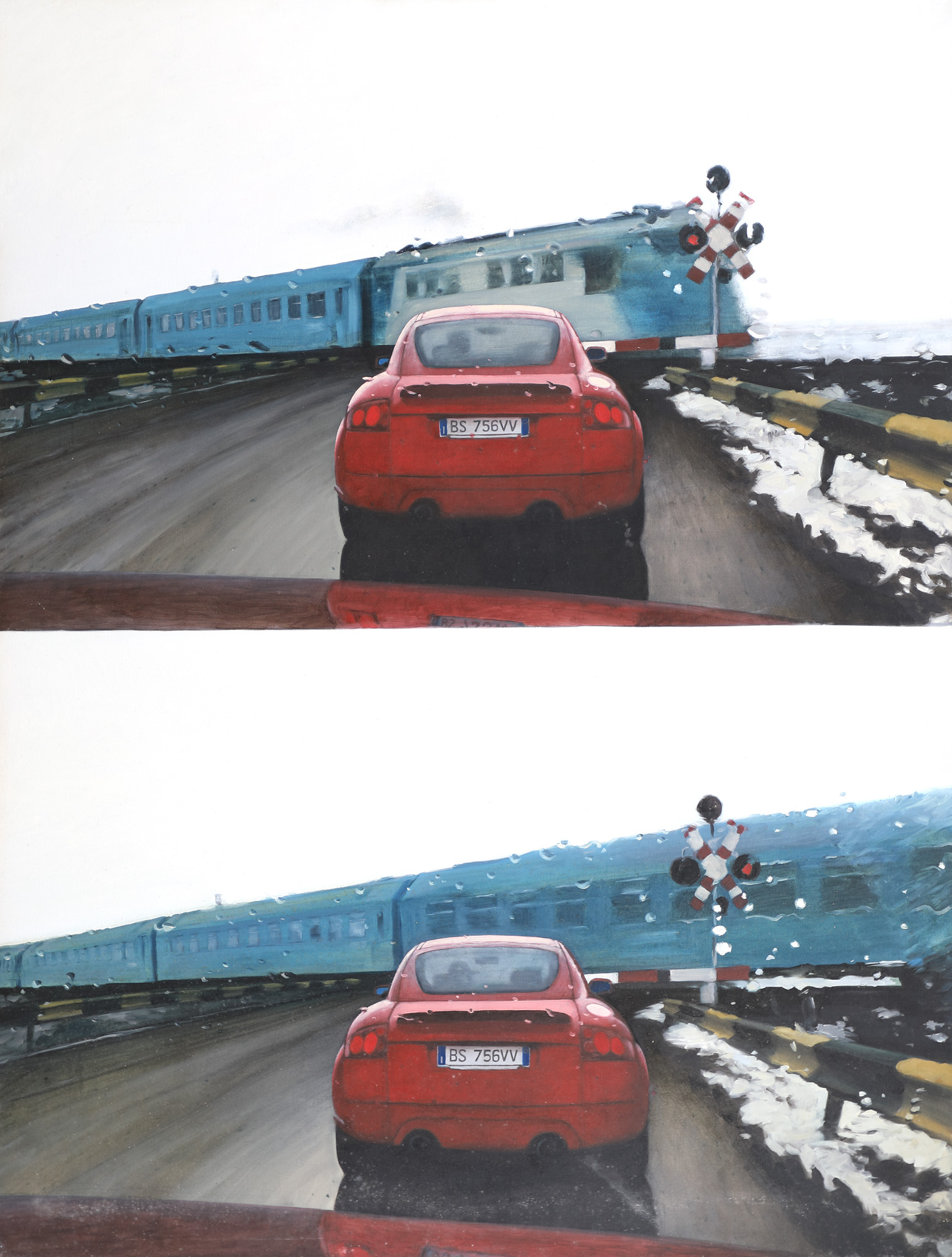 Contactul nemărginit cu arta se produce în copilăria timpurie, mai exact în perioada grădiniței, atunci când Roman Tolici, într-un veritabil acces de inspirație, adaugă unei teme aparent banale un artificiu ingenios. Schițând conturul unei case, copilul Tolici hotărăște să alăture, în planșa sa, detaliile unor țurțuri, așa cum le observă el în realitatea imediată. În această rememorare a artistului descifrăm, pentru prima oară, viitoarele preocupări pentru redarea fotografică a elementelor cotidiene. Roman Tolici s-a consacrat de-a lungul timpului drept un exponent remarcabil al realismului fotografic, tehnică prin care surprinde cu măiestrie poezia și suprarealismul existenței cotidiene. Își găsește sursele de inspirație în lucrurile simple și nu iese niciodată din casă fără aparatul de fotografiat. Procesul său de lucru include, așadar, documentări fotografice, care vor fi transformate ulterior în lucrări-reportaje sau în veritabile fresce reflexive ale spațiului real. În opera de față, artistul marchează trecerea timpului prin avansul trenului pe șine și prin valorificarea luminilor alternative ale semnului rutier. Tolici transcrie pictural povești fără sfârșit și propune, astfel, un tip de narațiune cinematografică în care gesturile ample, neobișnuite, nu își mai găsesc locul.