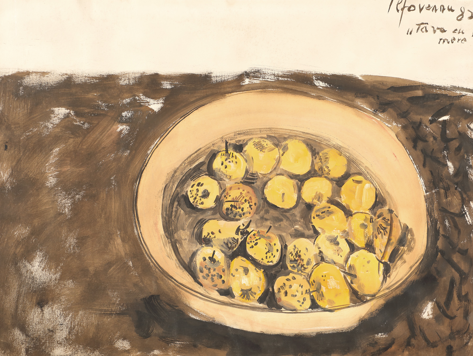 semnat, datat și intitulat dreapta sus, cu negru, "Ilfoveanu, (19)83, Tava cu mere"