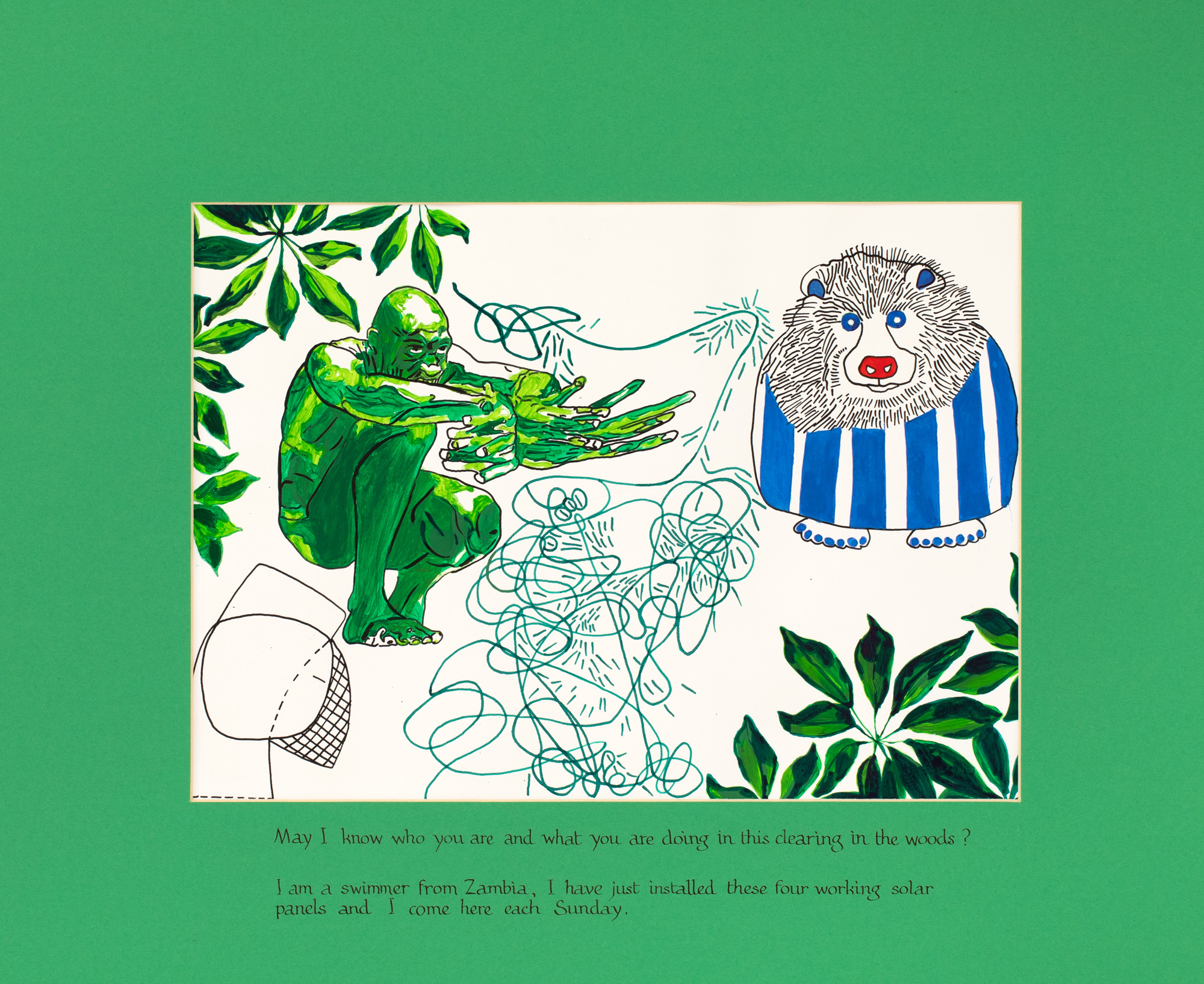 notat pe passepartout cu negru, ”May I know who you are and what are you doing in this clearing in the woods? I am a swimmer from Zambia, I have just installed these four working solar panels and I come here each Sunday"