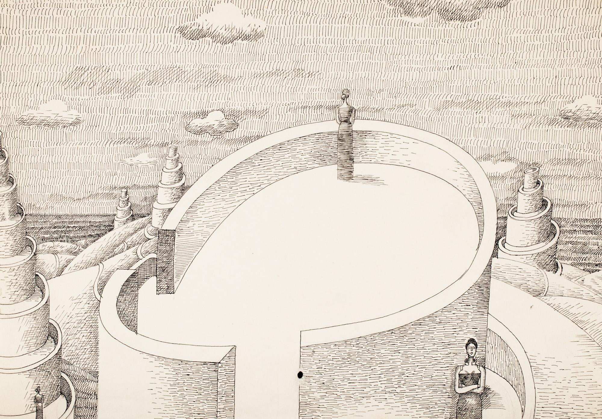 semnat, datat, notat și intitulat pe verso, ”Mihai Rusu, 1986, Desen original în peniță, Zigurate III”