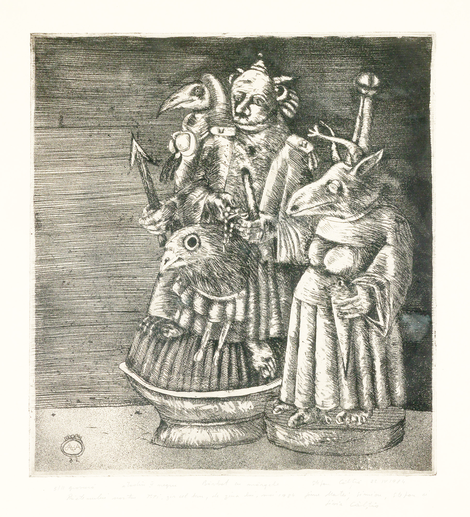 semnat, datat, intitulat, numerotat și dedicat central jos, în creion, "Ștefan Câlția, 22 IV 1984, Bărbat cu mărgele, 5/11, gravură, stadiu II negru, Prietenului nostru Titi, zis cel bun, de ziua lui, mai 1984"