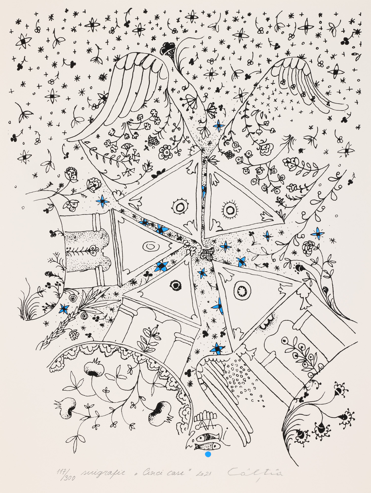 semnat, datat, intitulat și numerotat central jos, în creion, "Câlția, 2021, Casă albastră IV, 117/300"