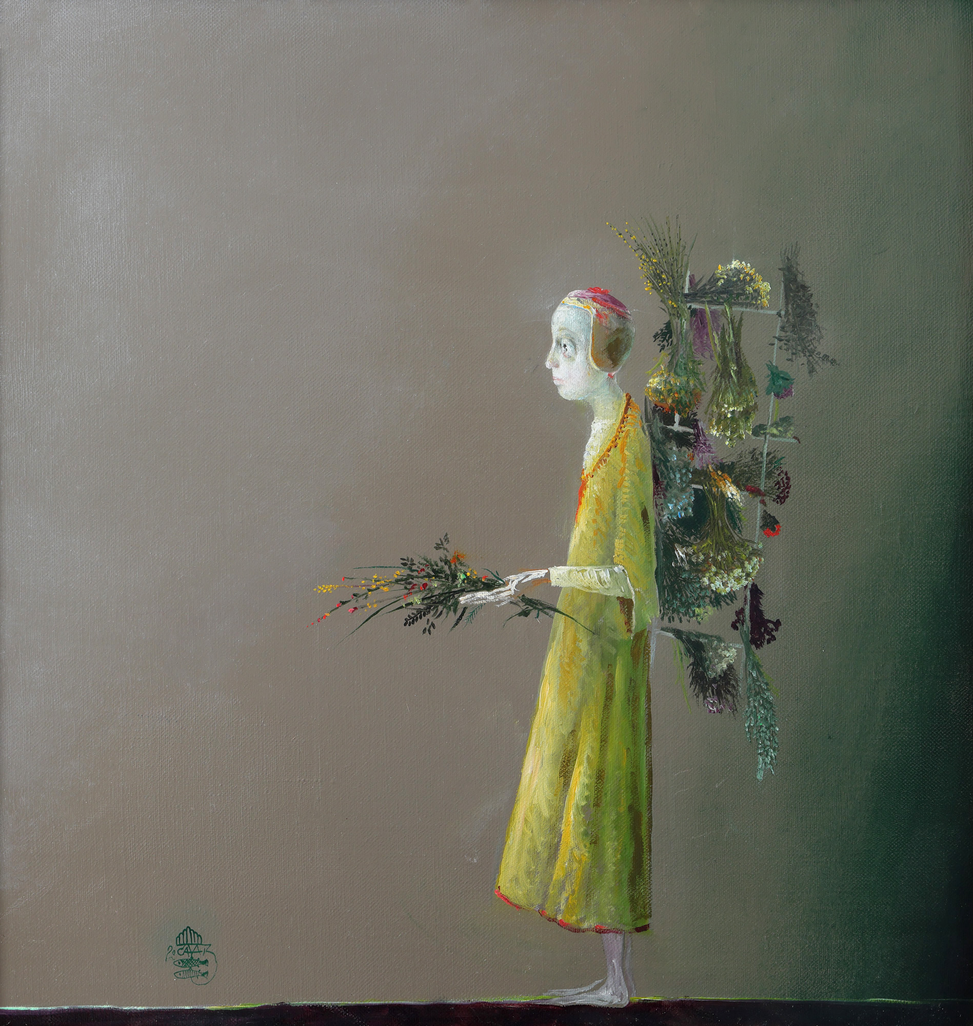 Observator omniscient al lumii în care rezidă, Ștefan Câlția se inspiră din poveștile construite de Pieter Bruegel și din compozițiile complexe ale lui Hieronymus Bosch și se îndreaptă către alegeri neobișnuite, cu personaje de dimensiuni reduse, pe care le plasează într-un spațiu amplu. Își caută și își află sursele de inspirație în locurile, lucrurile și oamenii care îi sunt aproape și devine un mediator al lumilor tangibile și al celor mai greu de pătruns. De la purtători de vâsc la personaje a căror recuzită e alcătuită din buchete de flori, artistul se îngrijește să curatorieze o splendidă galerie de personaje antropomorfe. Personajul purtător de buchete colorate duce cu sine un veritabil fragment de grădină, ori chiar o fracțiune a unui câmp de flori. Extrăgându-și seva creatoare din realitatea imediată, artistul mărturisea la un moment dat că obișnuia să transpună în pânzele sale rochiile pe care le crea soția sa; vestimentația personajului de față demonstrând, probabil, chiar un astfel de împrumut entuziast. Expozițiile organizate de artist în ultimii ani ne relvă interesul său pentru obiectele purtătoare de semnificații, obiectele-vestigii ale memoriei, obiecte de recuzită ce întregesc scenografia, coexistând armonios cu amprentele plastice atent alese. Covoare, piese de mobilier, buchete de flori uscate ori unelte de lucru își expun valoarea intrinsecă și atributele artistice, culturale, morale ori sociale. Artistul îmbină așadar candoarea manifestărilor sale plastice cu gingășia florilor pe care le inserează atent prin spațiul expozițional.