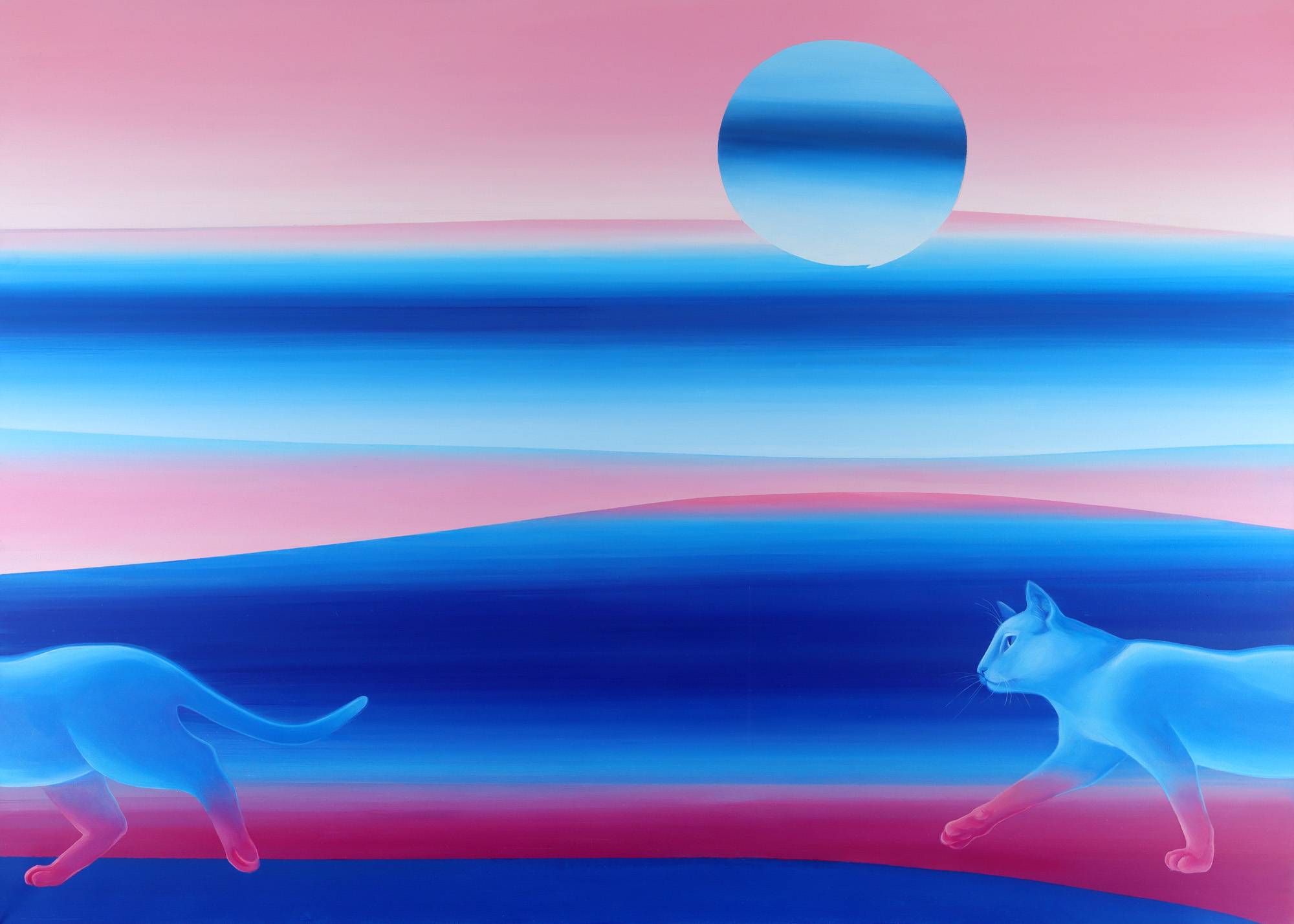 Problematica subconștientului și tema visului este una intens explorată în artele vizuale, Salvador Dali, Victor Brauner, Frida Kahlo fiind doar câțiva din artiștii internaționali care au consacrat o atenție deosebită acestei tematici. Lucrarea curentă, parte a proiectului de absolvire a Oanei Zbanț, este, deopotrivă, captivantă și relevantă din acest punct de vedere, al tematicii subconștientului. După cum mărturisește chiar artista, planul inițial a fost de a crea o zonă de confort, prin armonii de tonuri reci. "(...) însă pe măsură ce lucram am avut ideea de cadență, de metronom guvernant al unui proces regulat, Luna care veghează somnul, care vine și pleacă simultan fiindcă timpul își pierde de fapt sensul. Astfel am încercat să exemplific o stare de ațipire, o existență între cele două lumi, ca atunci când visăm și știm că visăm, însă nu alunecăm imediat în nici o parte. Ne menținem ca într-un soi de buclă sau spațiu intermediar. Simultaneitatea prezenței și absenței somnului am abordat-o și într-o manieră digitală, tinzând spre acel mix de care am pomenit, prin utilizarea gradientelor între albastru și violet, de asemeni prin utilizarea unor forme cât mai simple și precis delimitate. Arhetipul lunar apare în partea dreaptă sus, mi-am dorit să-l reprezint imperfect, ca și cum ar fi fost generat printr-un gest rapid de încheietură, iar peisajul pe care îl guvernează face trimiteri la teme pe care mi-am propus să le mai explorez, aceea a apei reflectând cerul; totodată poate fi interpretat ca un răsărit saharian de Luna, el este conceput de fapt să dea o idee cât mai vastă de extindere și spațialitate platformată, menținut în limite simpliste, pentru a nu atrage atenția și a sublinia personajul, făcând referire totodată la ideea menționată de spațiu intermediar, atât prin desfășurarea gradientală cât și prin dualitatea cromatică. Arhetipul se află într-un permanent circuit repetitiv, însă pașii ei nu se imprimă sau nu pot fi percepuți, la fel cum noi nu lăsăm urme în vise."