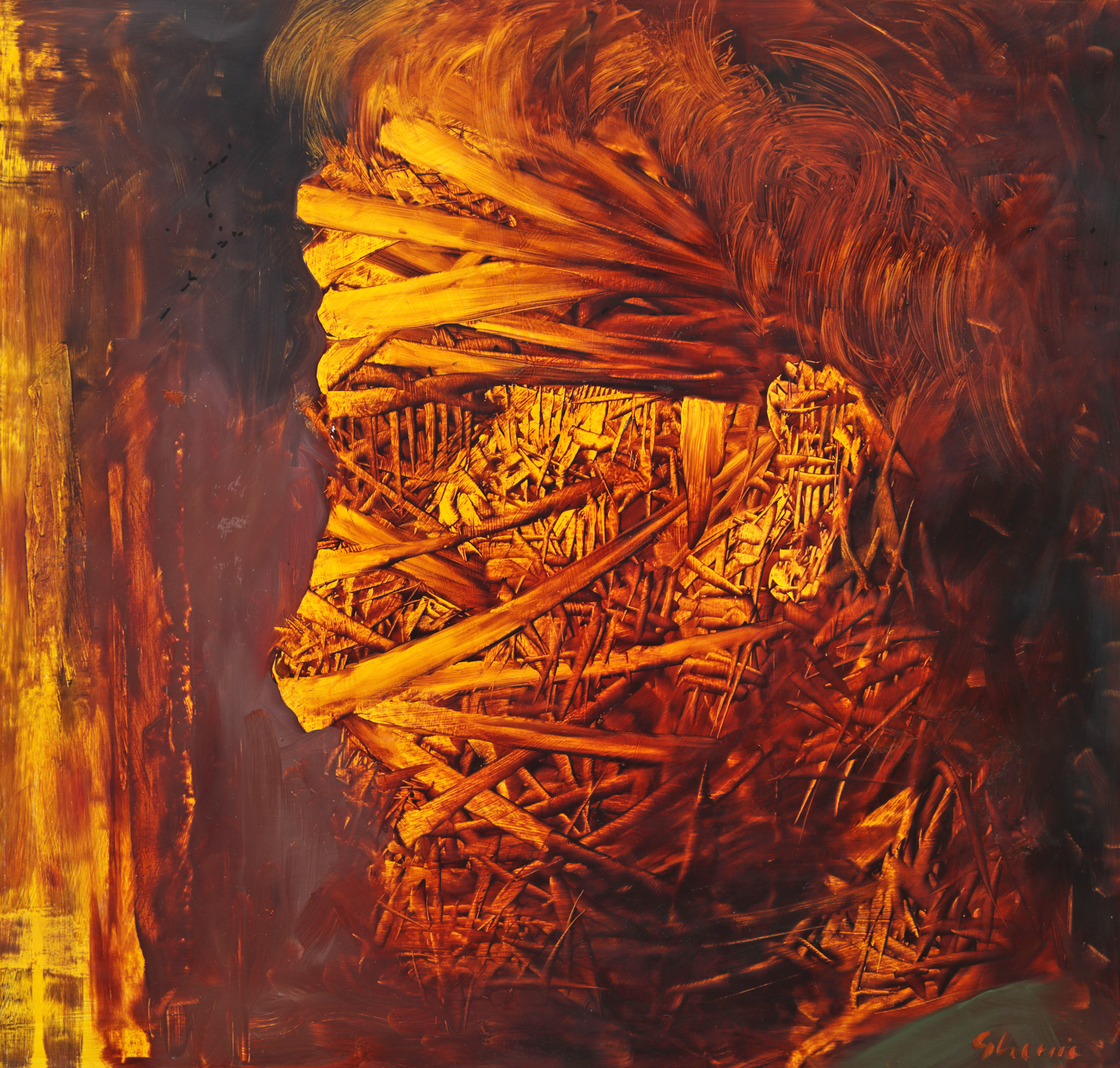 Pornind de la premisa că ”pictura este singurul mediu prin care se poate exprima natura viscerală a lumii”, Adrian Ghenie zugrăvește, printr-o mișcare browniană dictată de stările sale interioare, o artă uneori brutală, inspirată din istorie și senzațiile pe care i le trezește Europa de Est. Contactul său cu lumea artei e mijlocit de o vecină din orașul natal, care îl introduce pe Ghenie în lumea unor pictori precum Aivazovsky sau Repin. Tot ea îi observă și încurajează talentul și devine primul său critic. În 2001, artistul absolvă Universitatea de Artă și Design din Cluj-Napoca, dobândind tehnica și capacitățile de execuție corespunzătoare clasicismului. Odată cu descoperirea avangardei, se va produce o schimbare majoră de paradigmă în opera sa. În 2005, alături de colegul său, Mihai Pop, fondează la Cluj Galeria Plan B, care avea să devină unul dintre epicentrele vieții artistice din oraș. Galeria se va extinde, mai apoi, și în Berlin. În 2007, Galeria organizează pavilionul românesc al Bienalei de la Veneția, iar în 2015, Adrian Ghenie reprezintă - cu proiectul ”Darwin’s Room” - România în cadrul celei de-a 56-a ediții a Bienalei de la Veneția. Lucrările sale, a căror incontestabilă valoare e recunoscută la nivel mondial, se află în colecții precum: Centre Pompidou, Paris; The Metropolitan Museum of Art, New York; Los Angeles County Museum of Art; The Stedelijk Museum voor Actuele Kunst (S.M.A.K), Ghent; Museum of Modern Art, San Francisco; The Hammer Museum, Los Angeles; Centro de Arte Contemporáneo, Málaga; Francois Pinault Collection, Venice; Hort Family Collection, New York; David Roberts Collection, London; Titze Collection, Paris; The George Economou Collection, Athens; The Sander Collection, Darmstadt. De-a lungul timpului, mai multe dintre operele sale au reușit să treacă pragul de adjudecare de 1.000.000 de euro în diferite case de licitații recunoscute la nivel mondial. Artistul capturează în pânzele sale vulnerabilitatea, frustrarea, sau dorința. Ilustrează subconștientul și folosește, aproape coregrafic, o cromatică întunecată, brutală. Lucrările sale surprind figurativul, însă artistul nu ezită să apeleze la utilizarea obscurului, atât prin schimbarea punctului focal, cât și prin reprezentarea unor personaje lipsite de trăsături particulare. Adrian Ghenie incorporează în pânzele sale cinematicul prin folosirea luminii și a texturilor. Concepută la începutul anilor 2000, lucrarea de față face parte dintr-un ciclu mai larg pe care autorul îl dedică fragmentării și descompunerii chipurilor sau obiectelor pe care le înregistrează pictural în operele sale. Surprins din profil, portretul de față se îndepărtează în mod visceral de realitatea cotidiană și propune încifrări complexe prin ductul încorsetat al penelului. Într-un alt portret realizat în aceeași perioadă, Adrian Ghenie surprinde modelul în plan frontal, oferindu-ne acces direct asupra întregului chip al aceluiași personaj. Ochii, nasul, bărbia și gâtul protsgonistului sunt complet acoperite, prin badijonări și permutări tehnice și stilistice. Restul epidermului e transformat în frânturi și bucăți ce imită materiale tehnice, lăsând astfel loc interpretărilor de ordin psihologic. Artistul optează pentru aceeași cromatică în cadrul tuturor lucrărilor realizate pentru această serie, astfel că nuanțele roșiatice sau brun-cărămizii, contribuie la atmosfera apăsătoare pe care o emană întreaga compoziție.