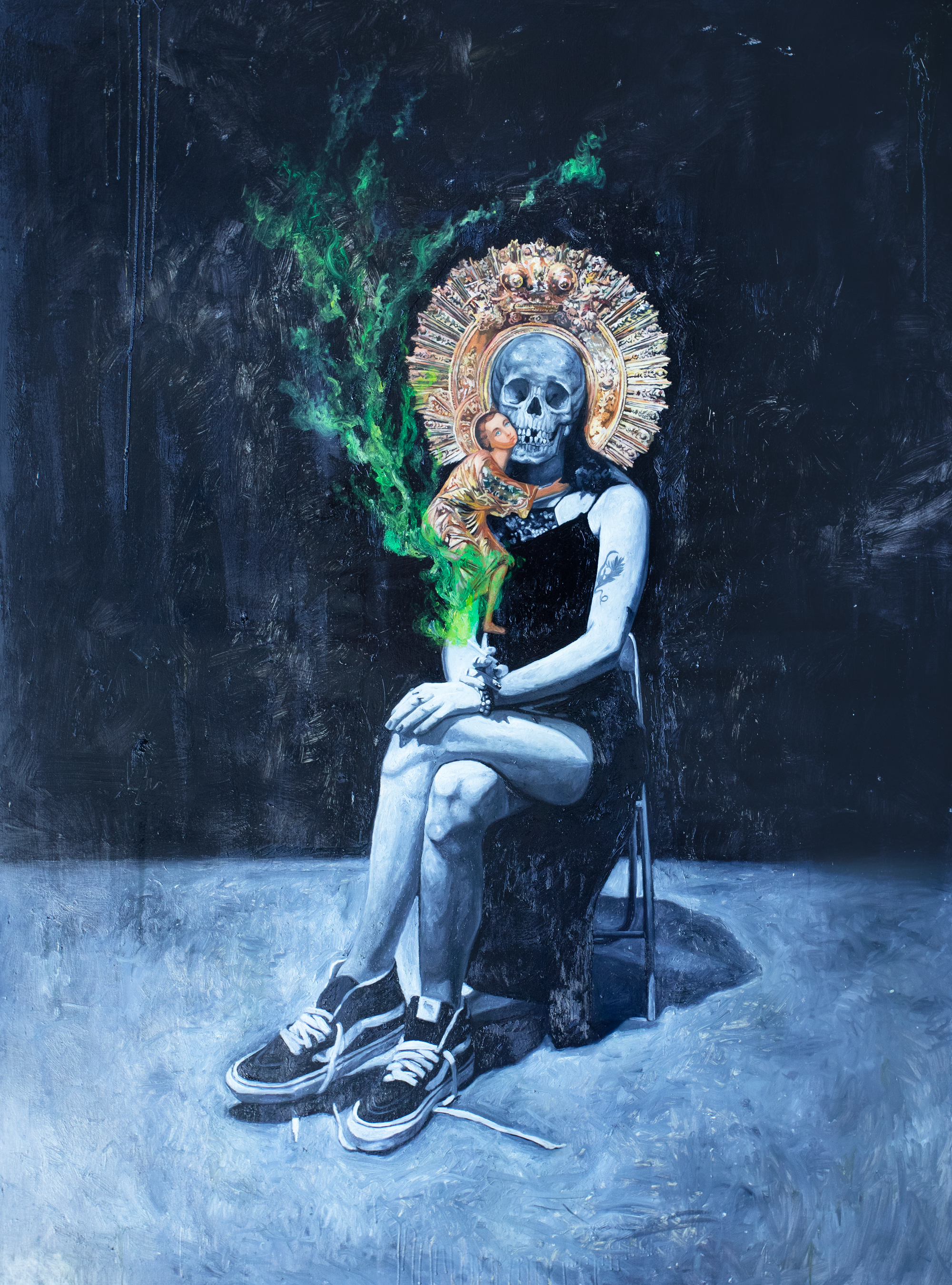 Paul Baraka Marat, unul dintre cei mai controversați artiști la momentul actual pe scena de artă contemporană românească, stârnește în continuare reacții puternice la adresa discursului său vizual himeric și tulburător. În urma expoziției ”Nymphs and Zombies”, din cadrul celei de-a 12-a ediții Art Safari, artistul a fost sancționat cu un avertisment, iar organizatorii expoziției au fost amendați de către Consiliul Național pentru Combaterea Discriminării (CNCD), din cauza presupusului sacrilegiu grafic prezent în lucrările sale. În urma acestui incident s-a creat o întreagă dezbatere publică despre condiția curentă a libertății de exprimare în artele vizuale și puterea sau efectele reacțiilor unui anumit tip de public asupra structurilor instituționale ale artei contemporane. De asemenea, disensiunea dintre mai multe categorii de public, martor al expoziției în cauză, ridică foarte multe semne de întrebare referitoare la măsura în care înțelegem intenția reală a artistului și motivația din spatele alegerilor unui anumit set de simboluri în propriul construct vizual. În ciuda concepțiilor generale care privesc opera lui Baraka ca o desacralizare a elementelor cheie din iconografia creștină, în mod paradoxal, acesta își asumă puterea de a sanctifica tot ceea ce ține de profan, atât persoane, cât și locuri sau chiar situații care par a fi în antiteză cu sfera divinului. Opera sa, dominată de o oarecare melancolie criptată prin anomalii ce țin de domeniul absurdului, este, de fapt, profund încărcată cu mesaje transgresive care au rolul de a atrage atenția asupra emoțiilor provocate de neconcordanțele din societatea în care trăim. În lucrarea ”Fecioara cu pruncul”, care face parte din seria ”Rolls Royce Phantom”, Paul Baraka portretizează candoarea aparentă a unui personaj feminin, decorat cu un nimb bogat ce conturează craniul sugestiv condiției efemere a tuturor lucrurilor. Conservându-și sentimentele pentru posteritate, artistul configurează chipul misteriosului personaj tocmai prin lipsa figurii acestuia, punând accent pe detaliile care devin astfel definitorii.