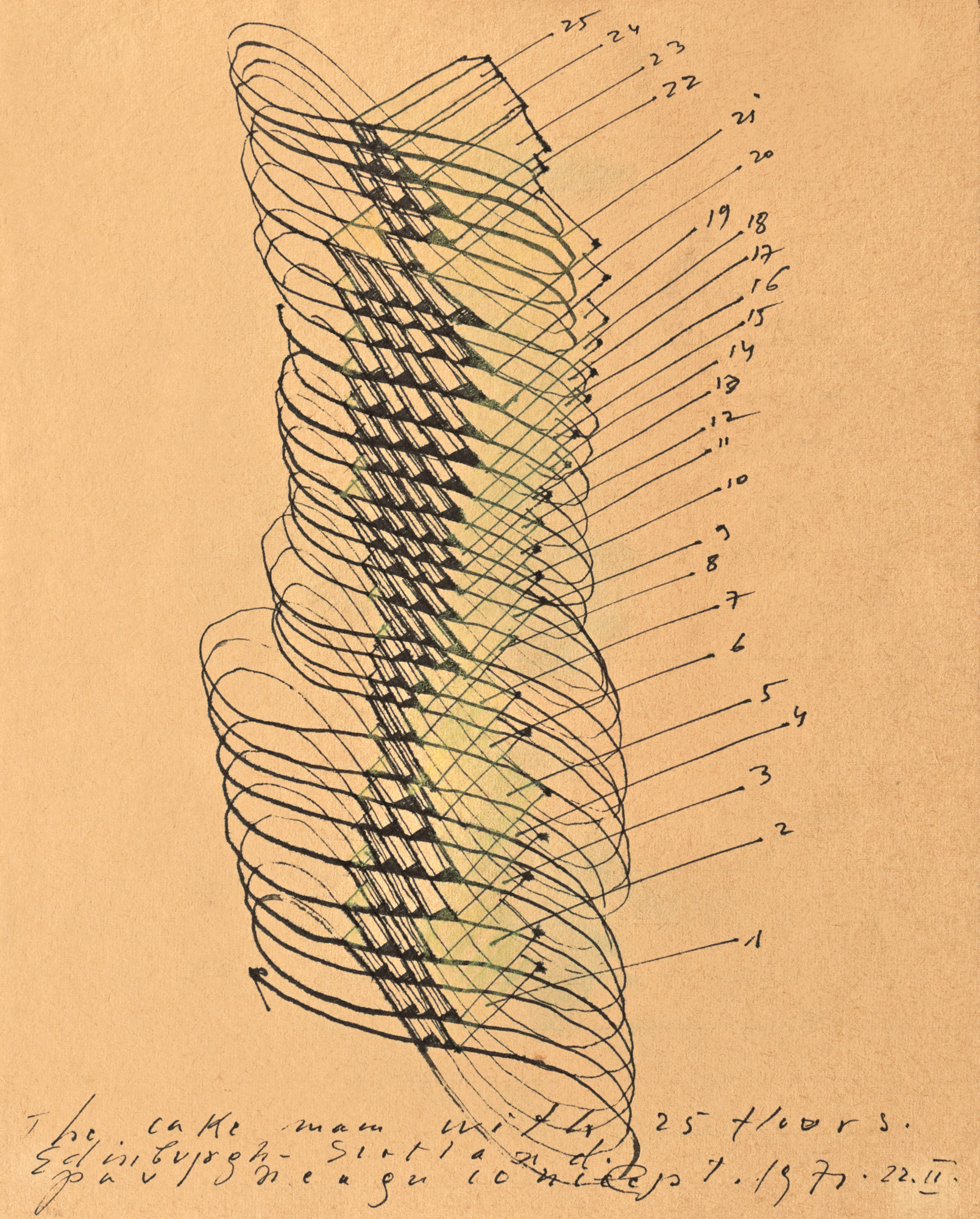 semnat, datat, intitulat și localizat central jos, cu negru, "Paul Neagu, concept, 1971.22.II, The Cake Man with 25 Floors, Edinburgh, Scotland"