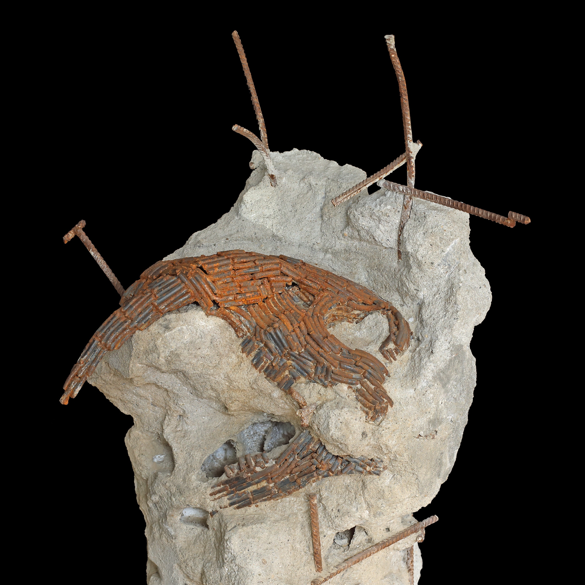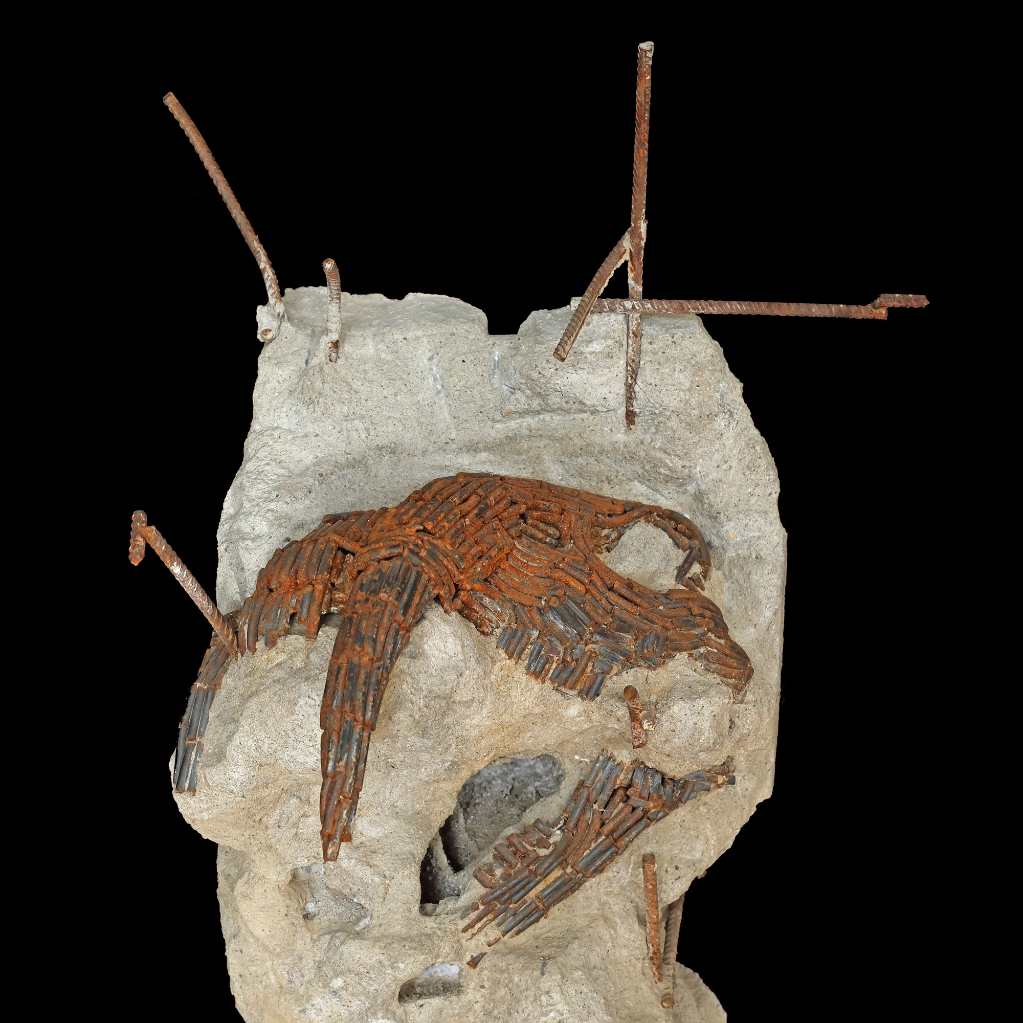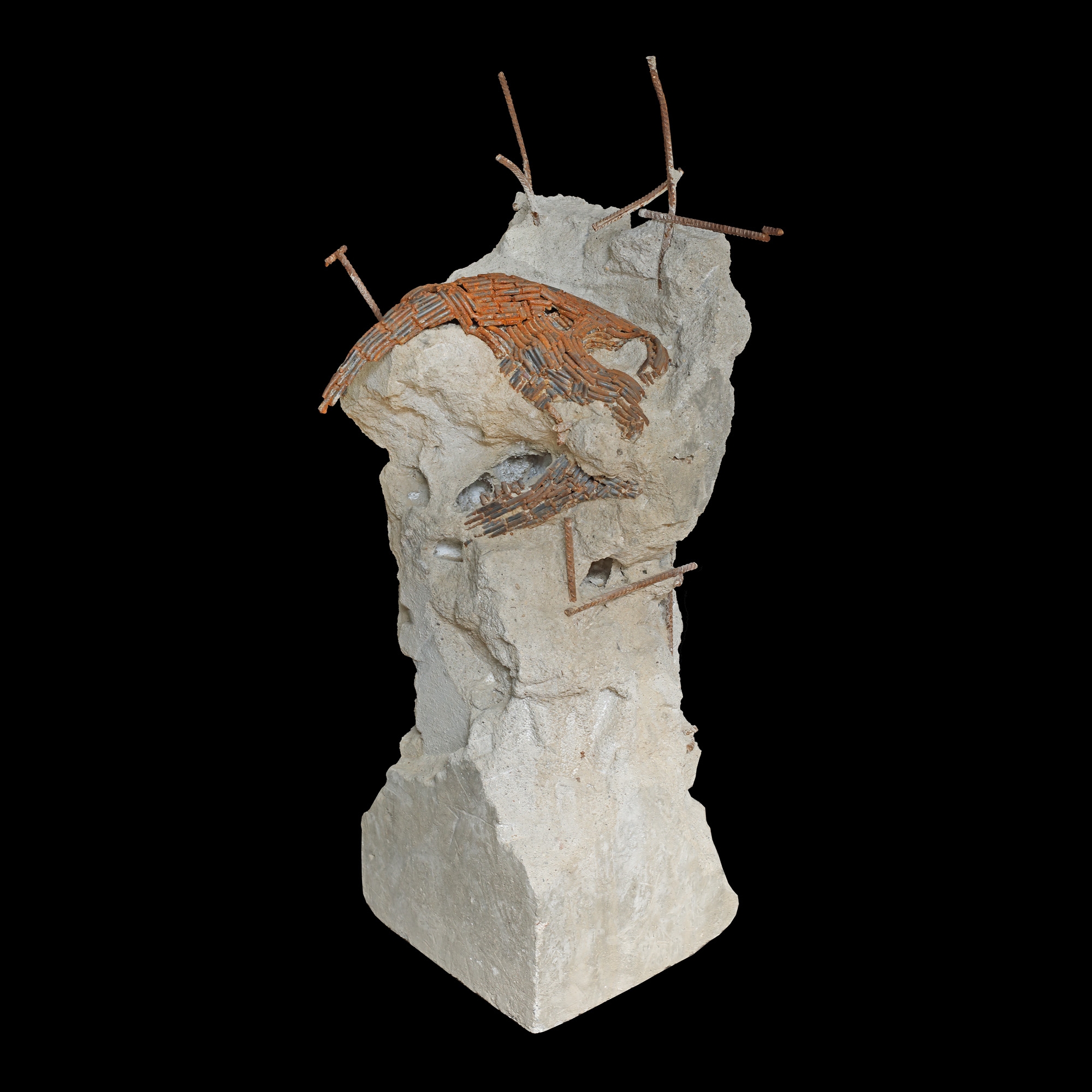 Lucrarea focalizează asupra relației problematice dintre natură și produsele civilizației. Betonul este un material ce invadează mediul natural iar anorganicitatea, densitatea și durabilitatea lui exprimă artificialul nociv. Conflictul este exprimat de această sculptură cu aparența unei structuri din beton armat care închide în ea, ca într-un strat geologic al antropocenului, un craniu de animal fosilizat, prins ca într-o capcană de procesul de extindere al civilizației betonului și de extincția a ceea ce era odată natural și liber. (Adrian Piorescu)
