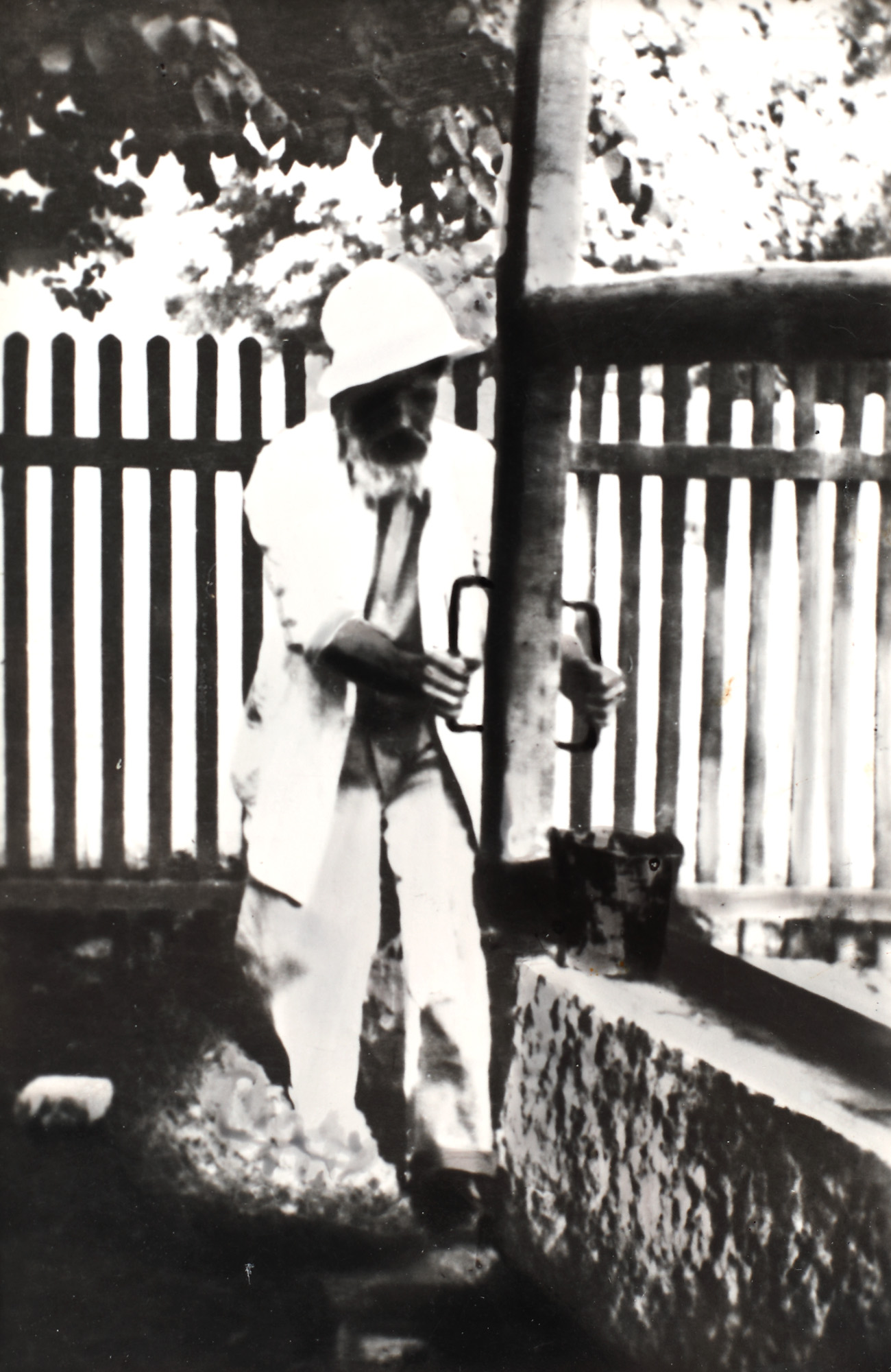 57. Constantin Brâncuși lucrând la joagăr pentru ridicarea "Porții Sărutului" [1938]