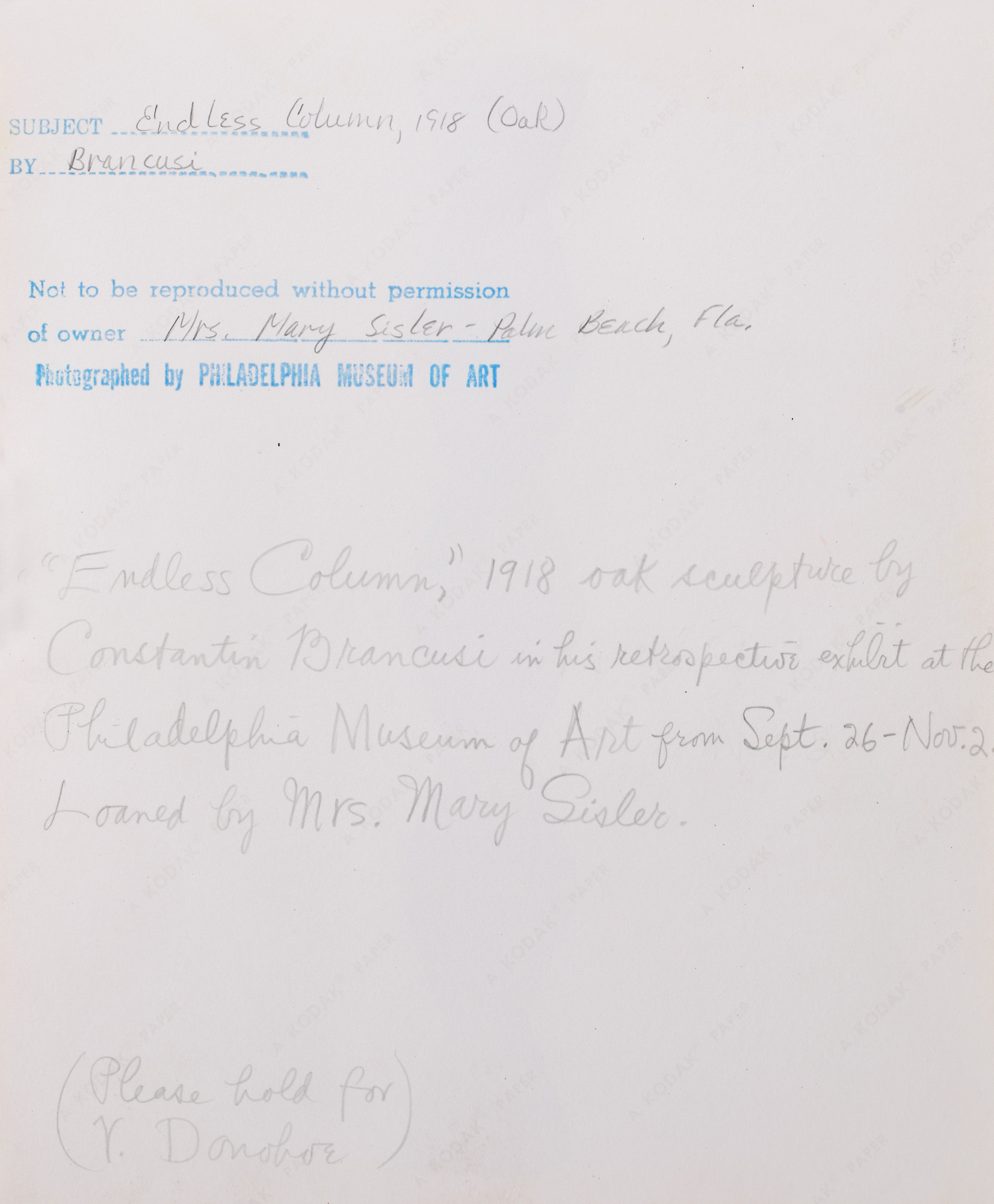 Fotografie realizată de Philadelphia Museum of Art cu ocazia expoziției itinerante „Constantin Brancusi 1876-1957: a Retrospective Exhibition”, 23 Septembrie – 15 Noiembrie 1969. Opera „Coloana fără sfârșit” (1918) se află astăzi în colecția MOMA, New York (donată de Mary Sisler).