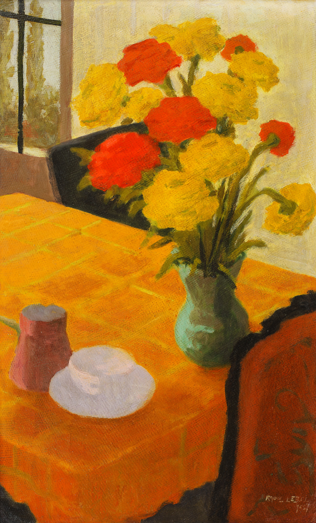 semnat și datat dreapta jos, cu galben, ”Raoul Lebel, 1957”