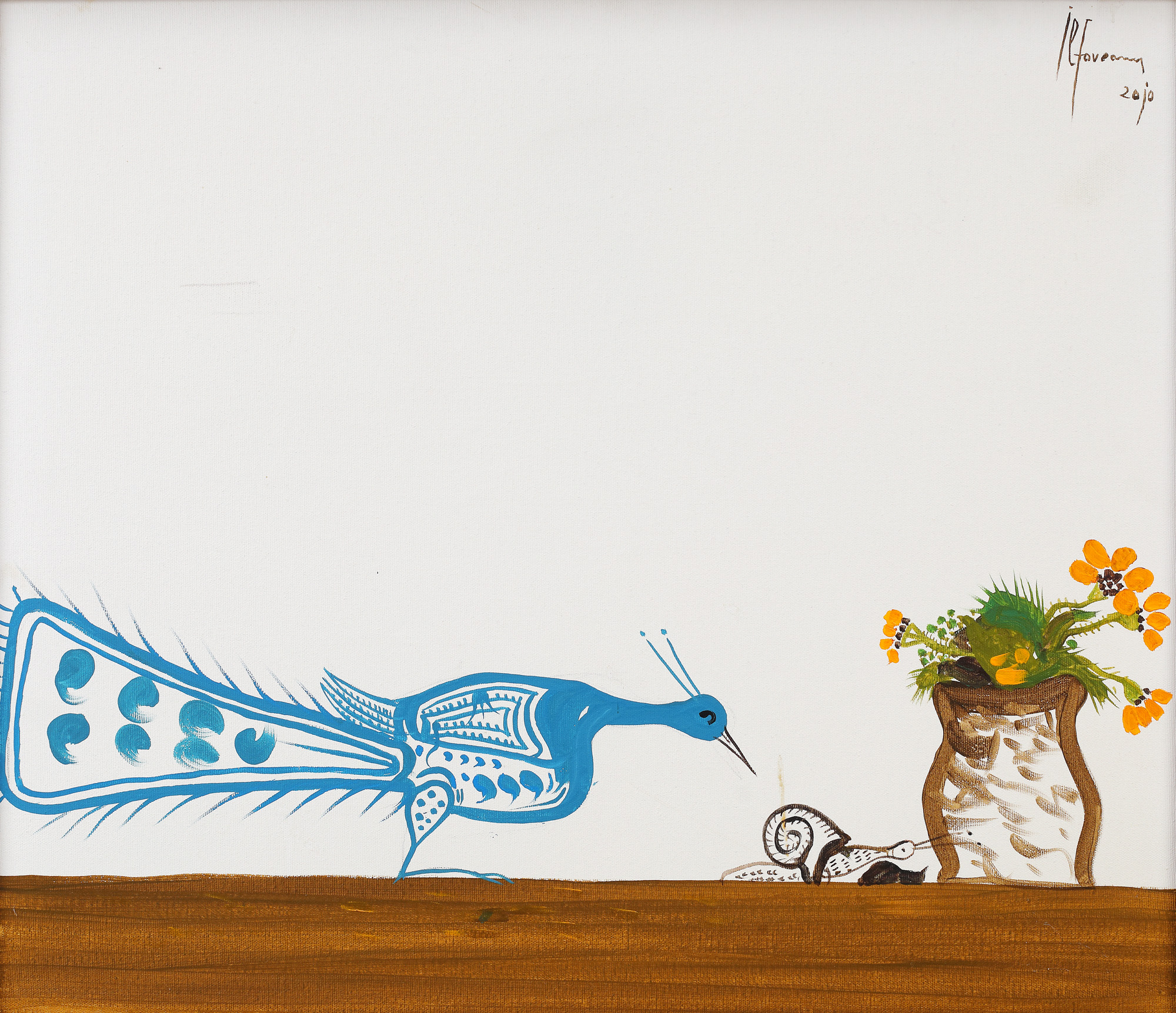 semnat dreapta sus, cu brun, "Ilfoveanu, 2010"; semnat, datat și intitulat pe verso, cu negru, "Ilfoveanu, 2018, Păunul albastru"