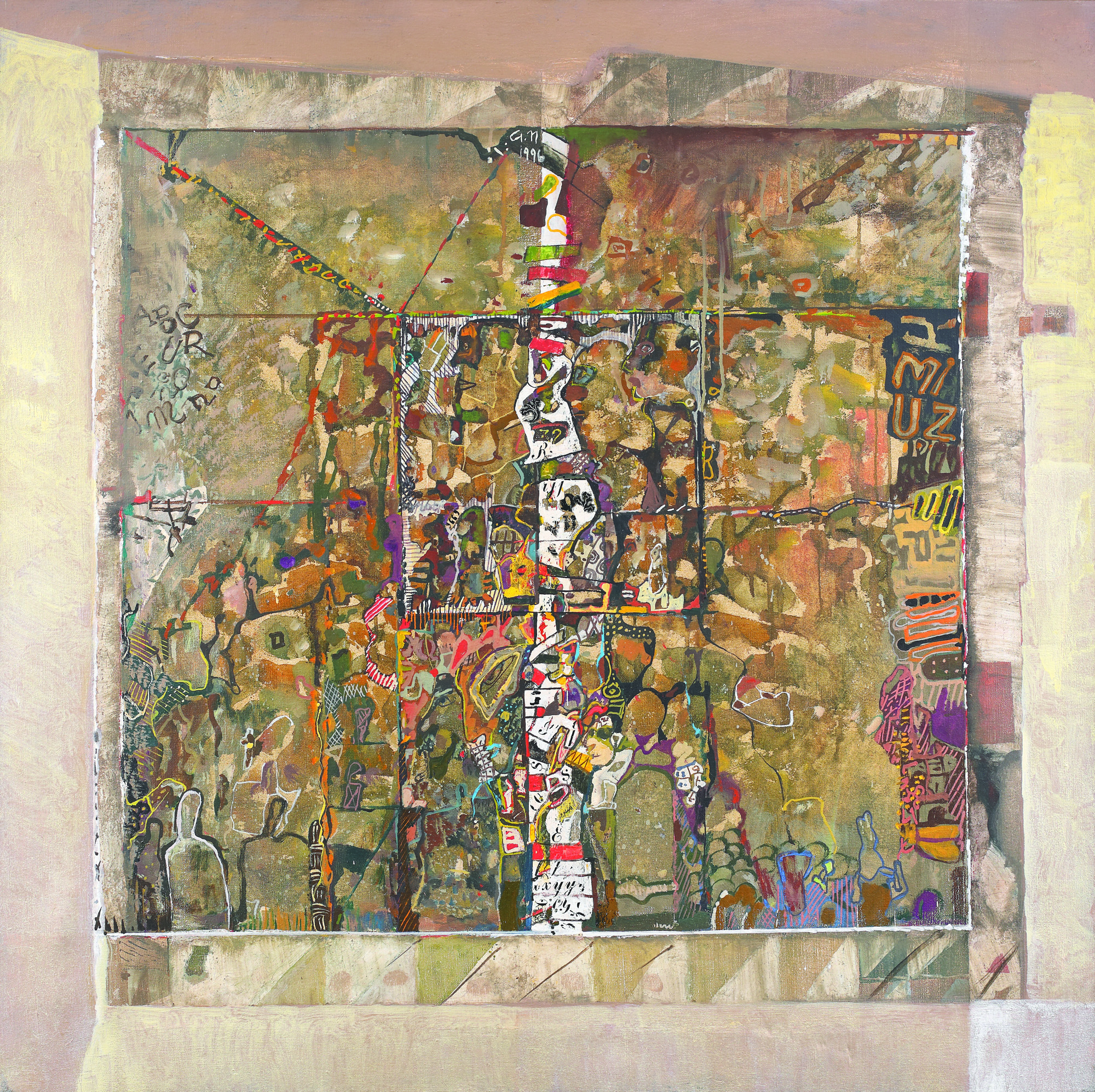 semnat și datat central sus, cu brun, "GN, 1996"; semnat și intitulat pe verso, în peniță, "Georgeta Năpăruș, Verticală"