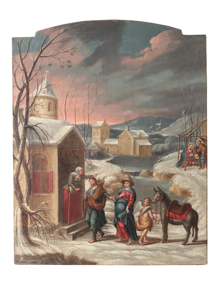 Lucrarea aparține școlii flamande și ilustrează 2 scene legate de Nașterea lui Isus. Scena ce ocupă prim-planul ilustrează Intrarea Maicii Domnului în Bethleem și căutarea locului pentru a naște, scena din planul secundar înfățișează pe pruncul Isus deja născut, vegheat de Fecioara Maria și de Iosif.