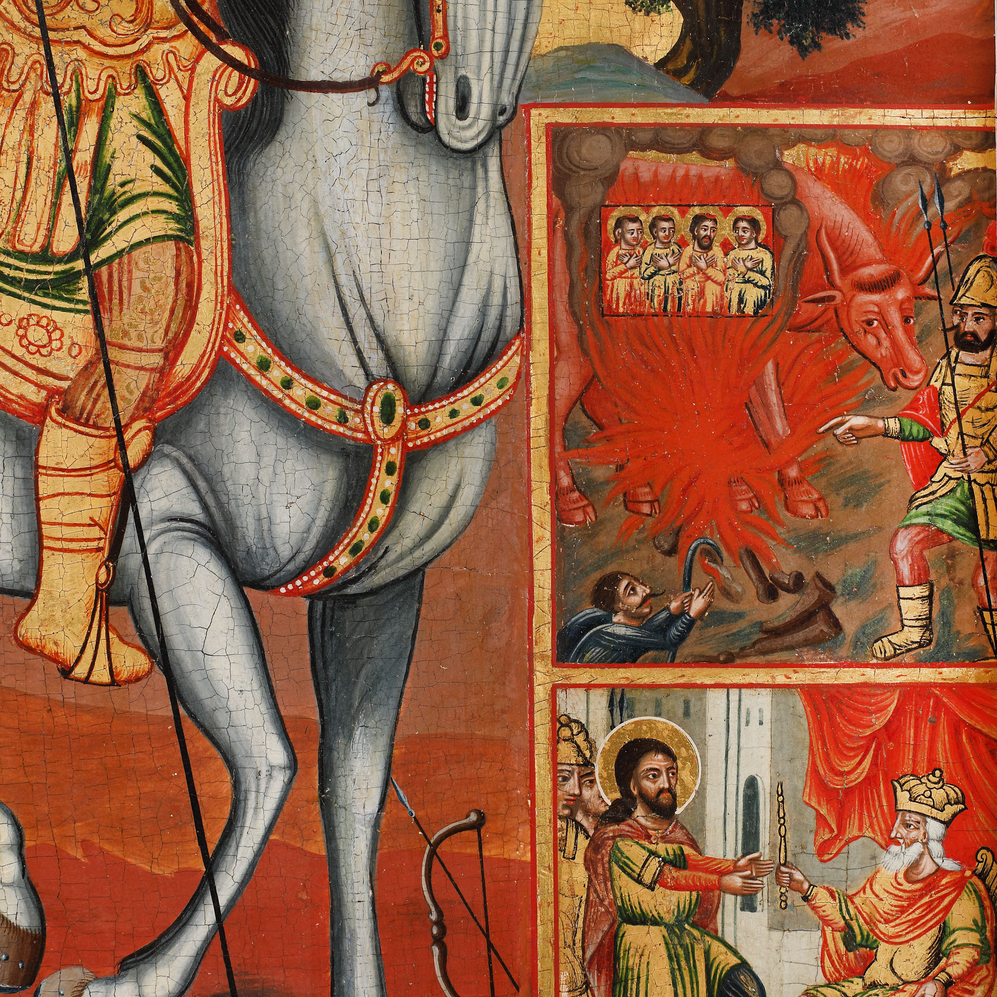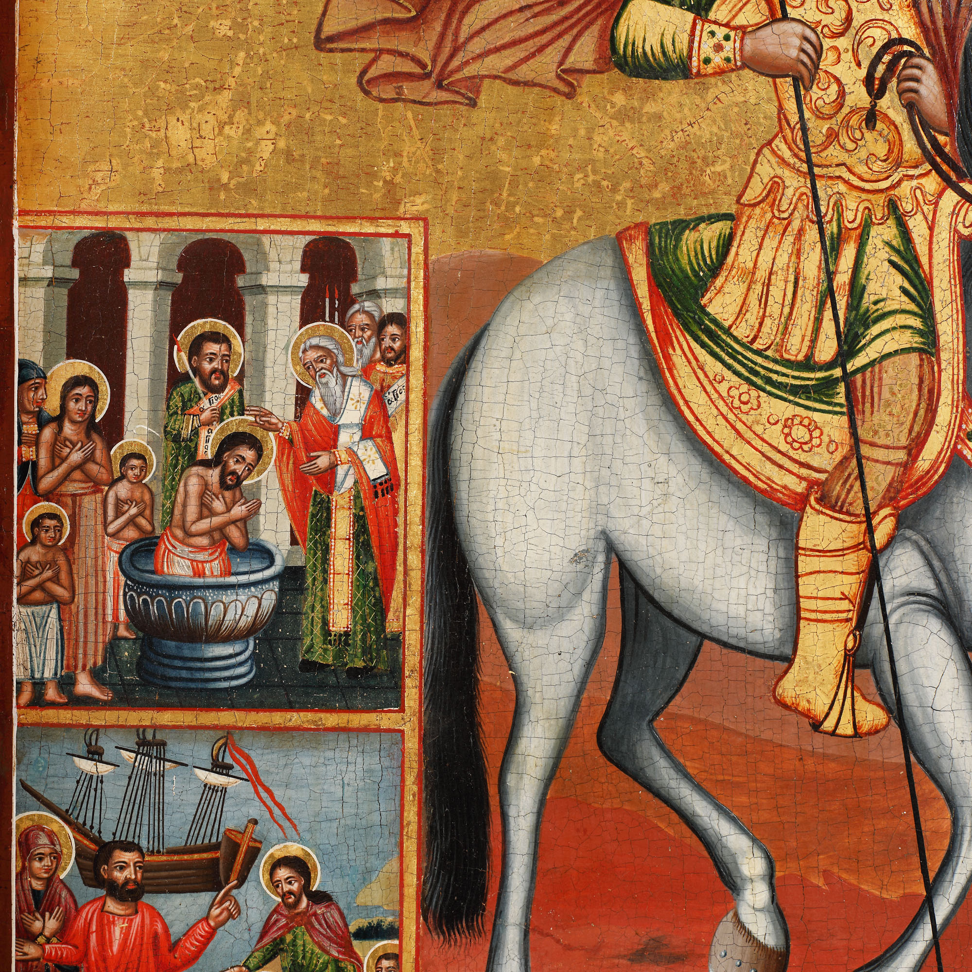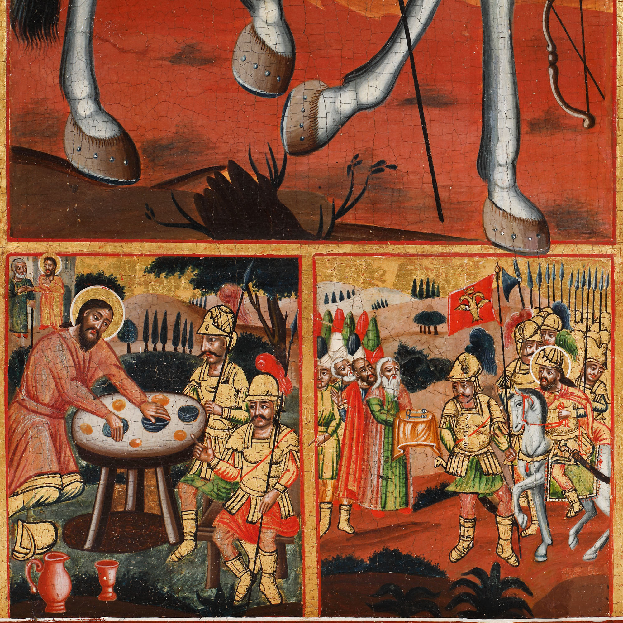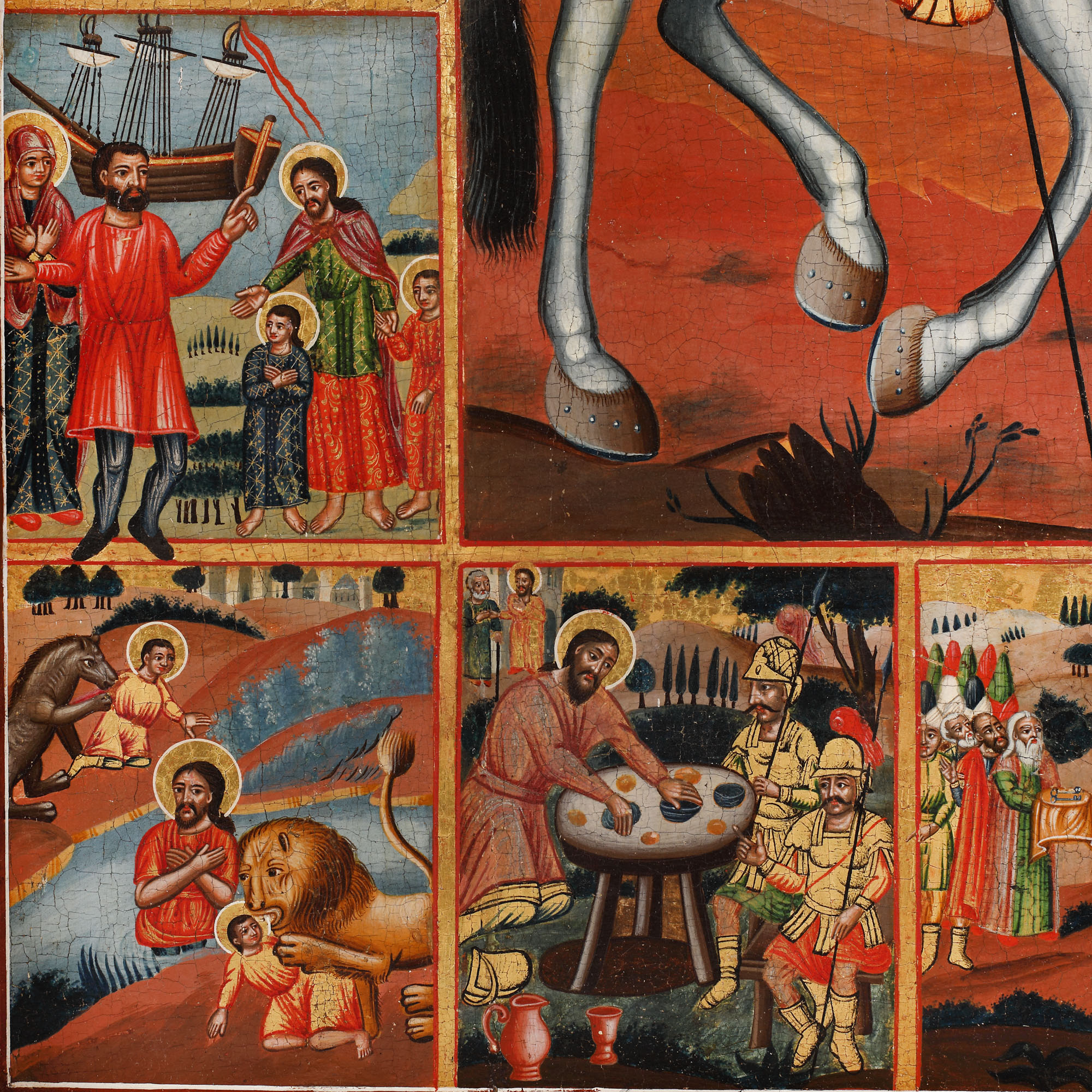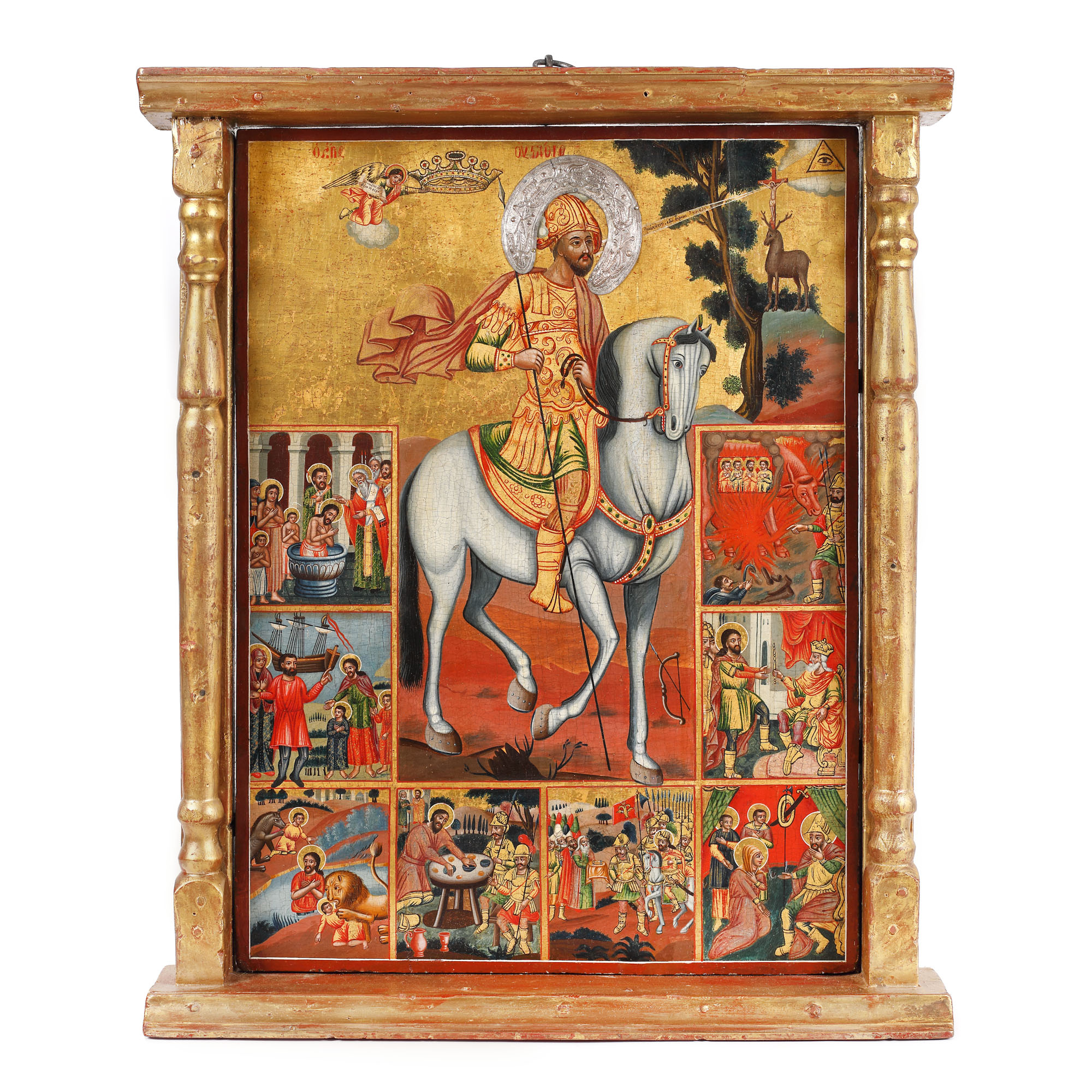 56. Icoană pe lemn, cu riză din argint, ”Sfântul Eustație și opt scene din viață sa”, școală grecească, a doua jumătate a sec. XVIII, piesă rară, de colecție