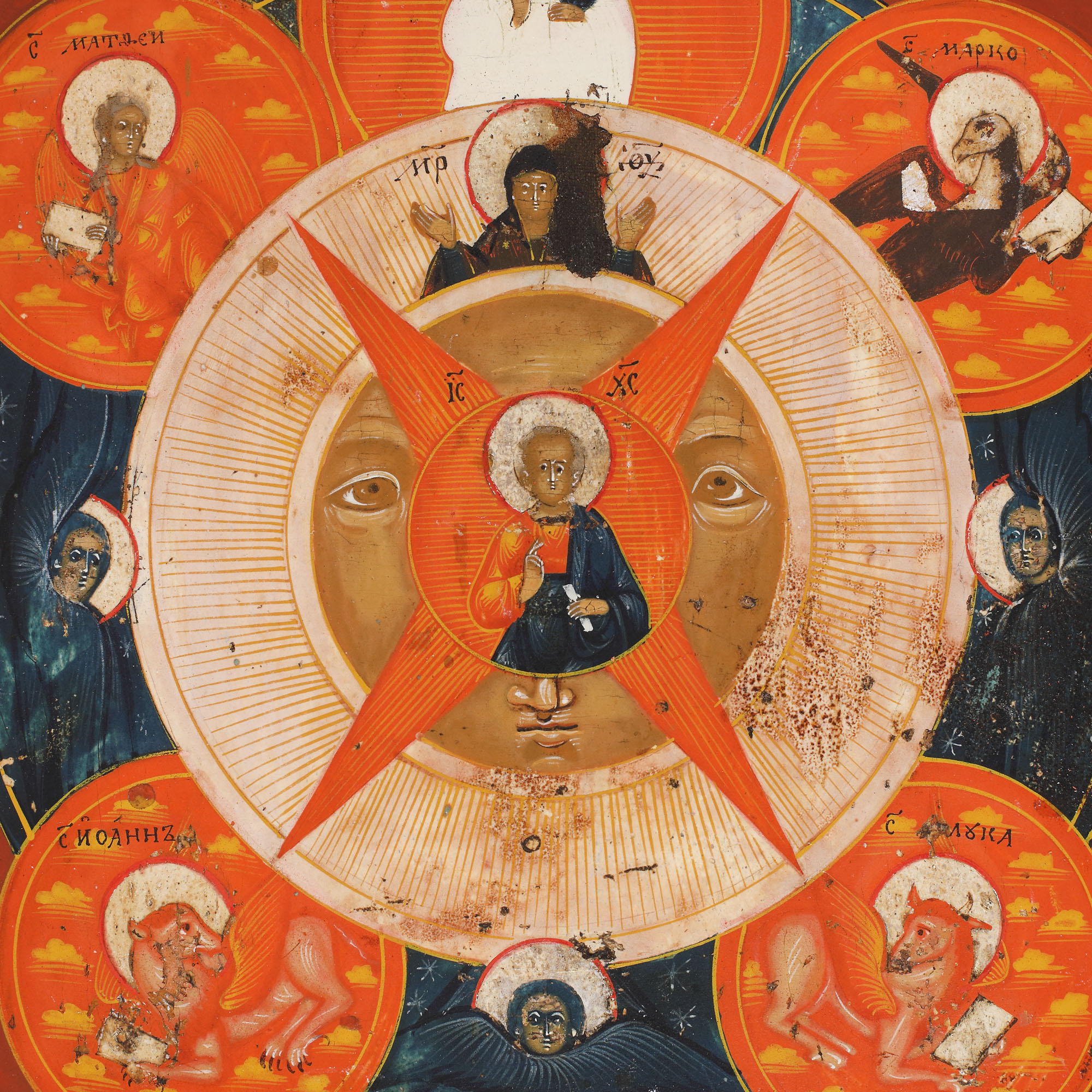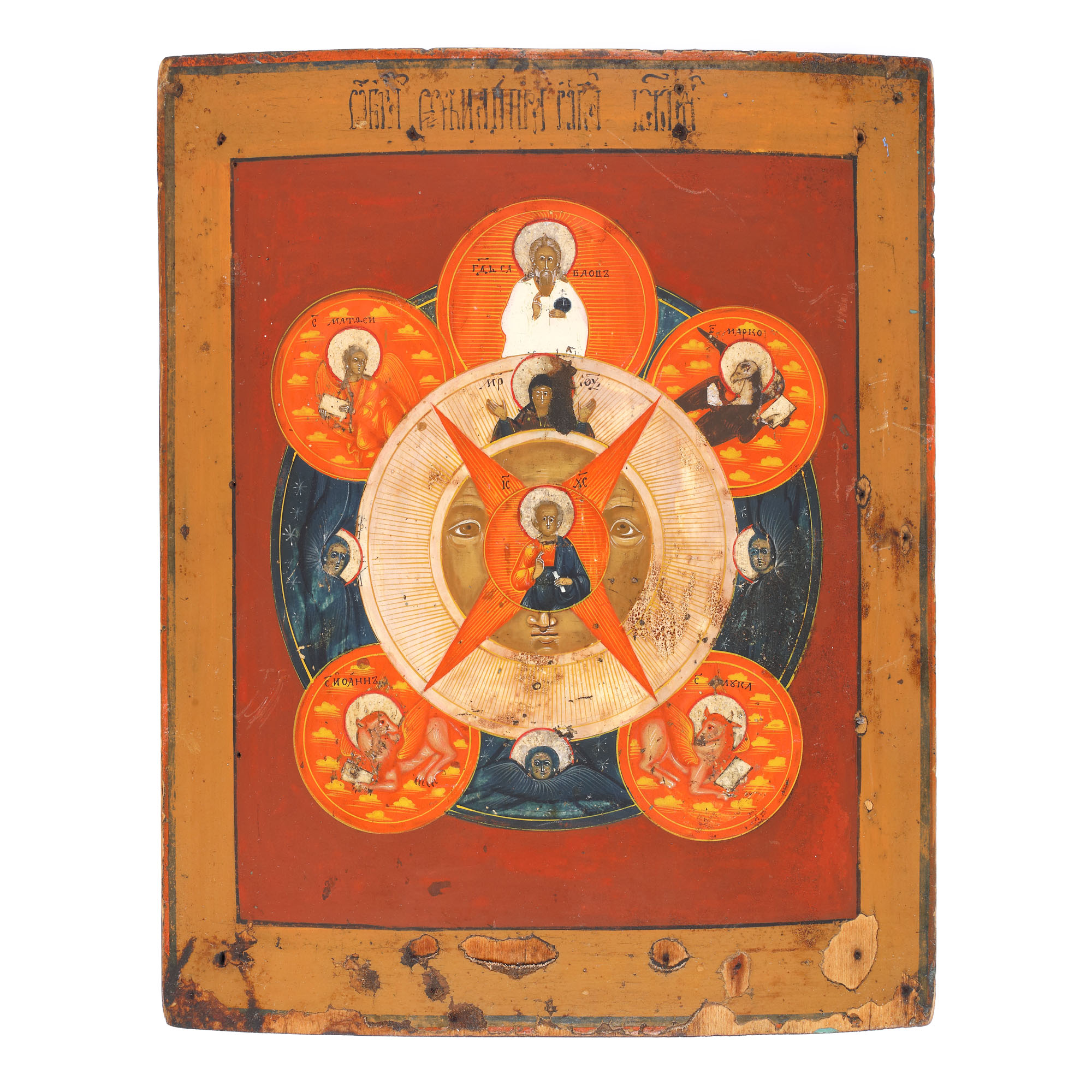 60. Icoană pe lemn, ”Ochiul a toate văzător (Icoana cărbunelui lui Isaia la ivirea soarelui)”, școală rusească, jumătatea sec. XIX, piesă rară