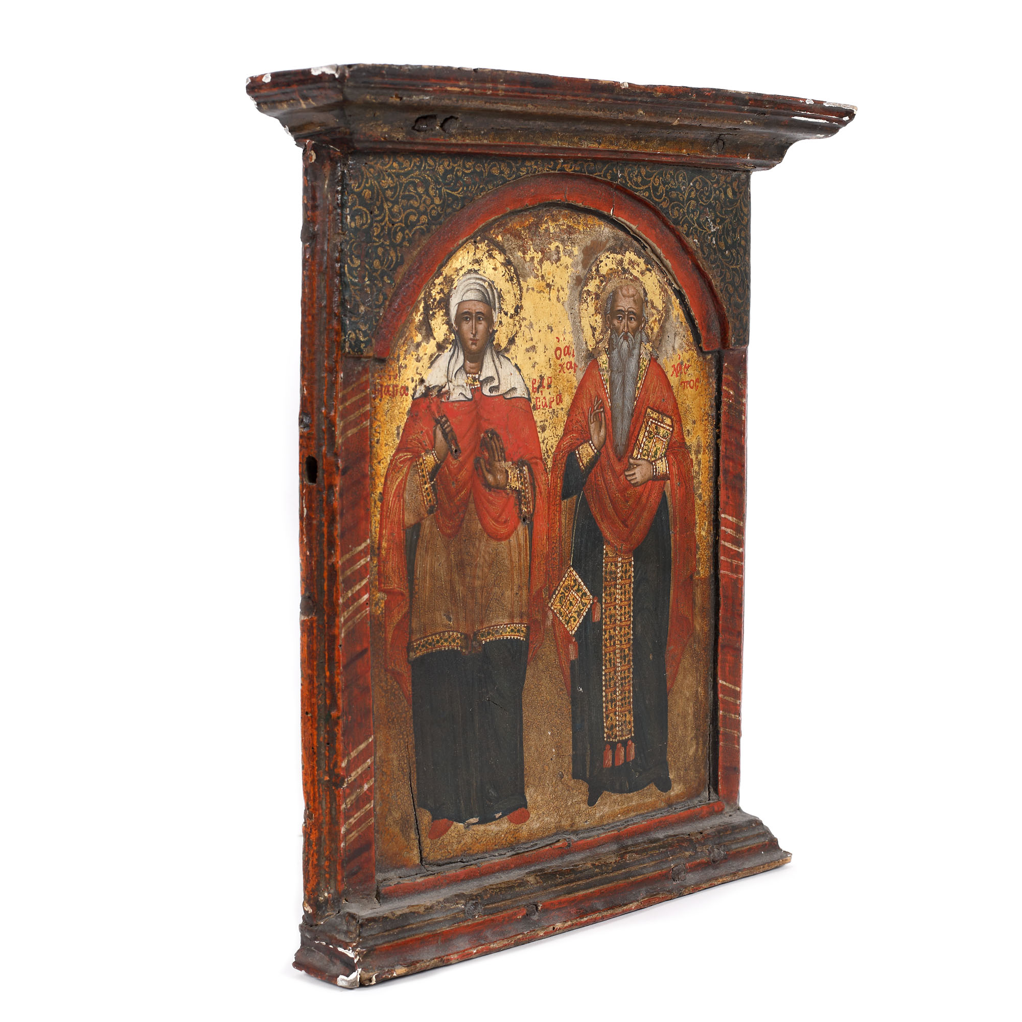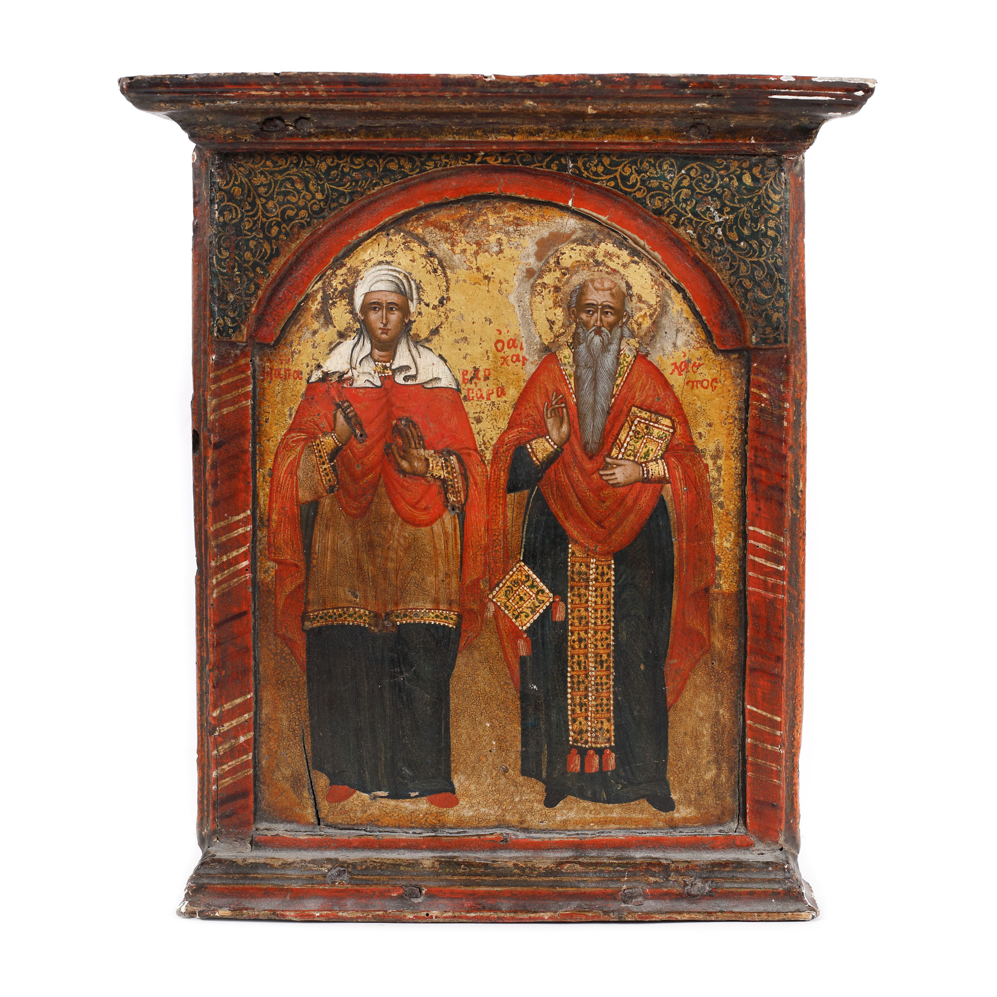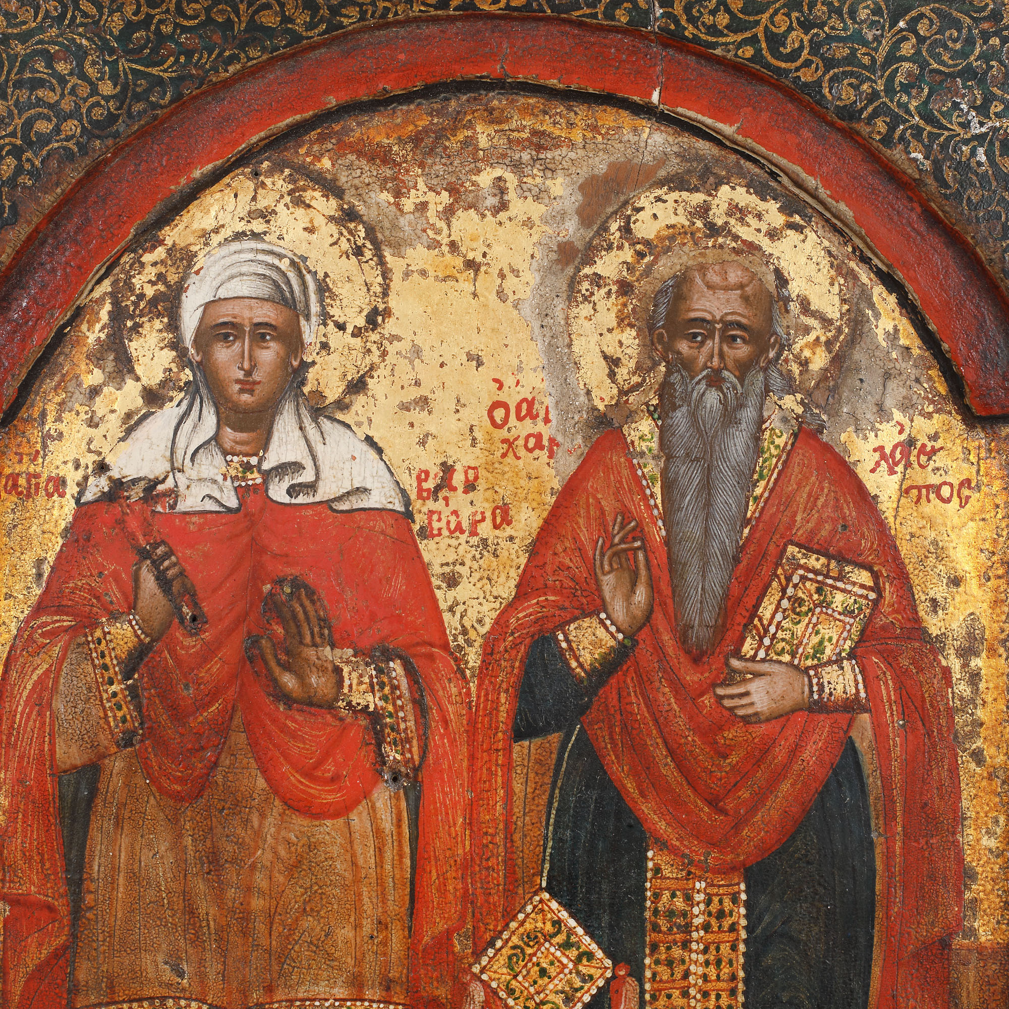 58. Icoană pe lemn, ”Sfânta Varvara și Sfântul Haralambie”, școală grecească, jumătatea sec. XVIII, de colecție
